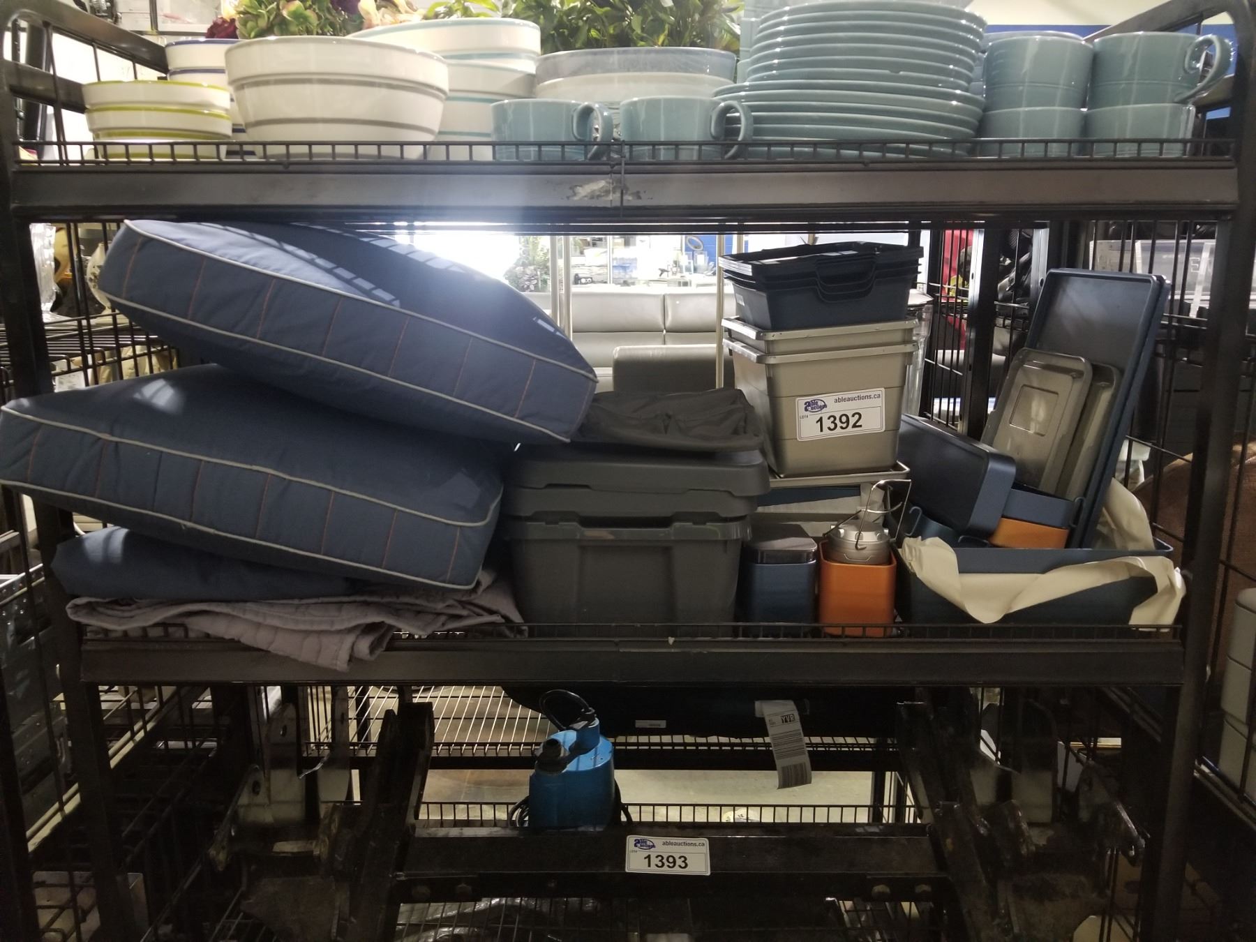 PLASTIC BINS, CONTAINERS, CUSHIONS, SMALL LANTERN & LINEN