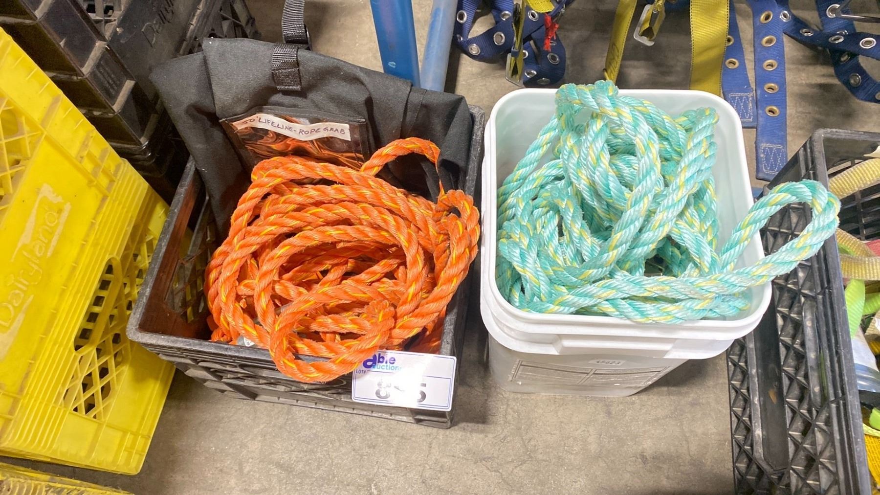 PLASTIC CRATE OF 50' LIFELINE - ROPE GRAB & BUCKET OF ASSORTED SAFETY ROPE *CRATE INCLUDED*