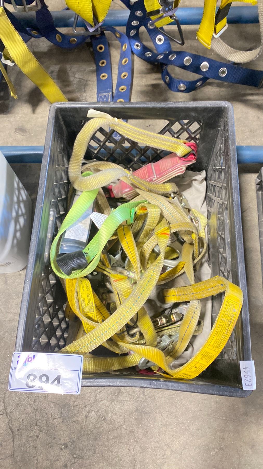 PLASTIC CRATE OF SAFETY HARNESS LANYARDS & ASSORTED SAFETY STRAPS *CRATE INCLUDED*