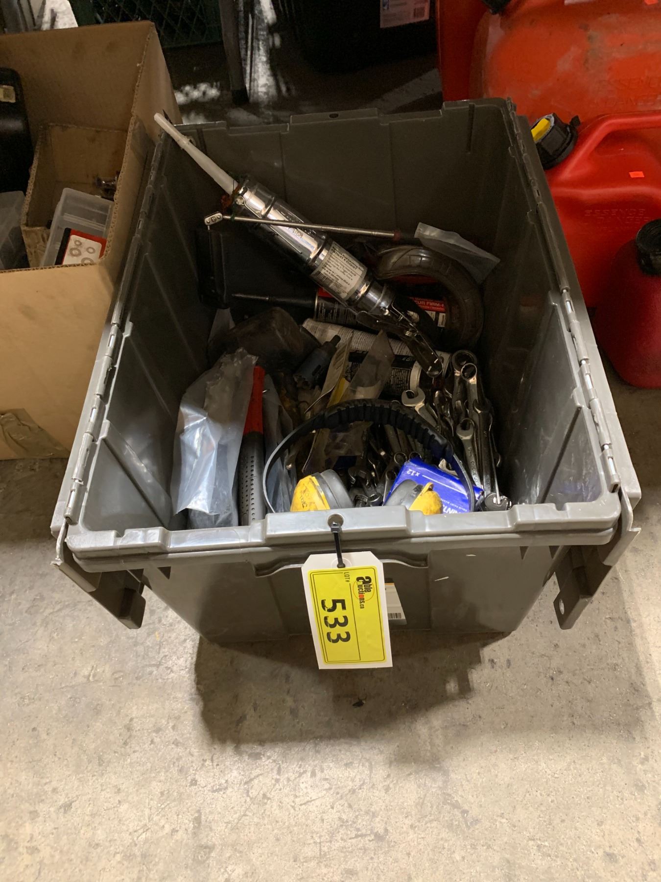 PLASTIC FOLD TOP BIN WITH ASSORTED HAND TOOLS ( BIN INCLUDED )