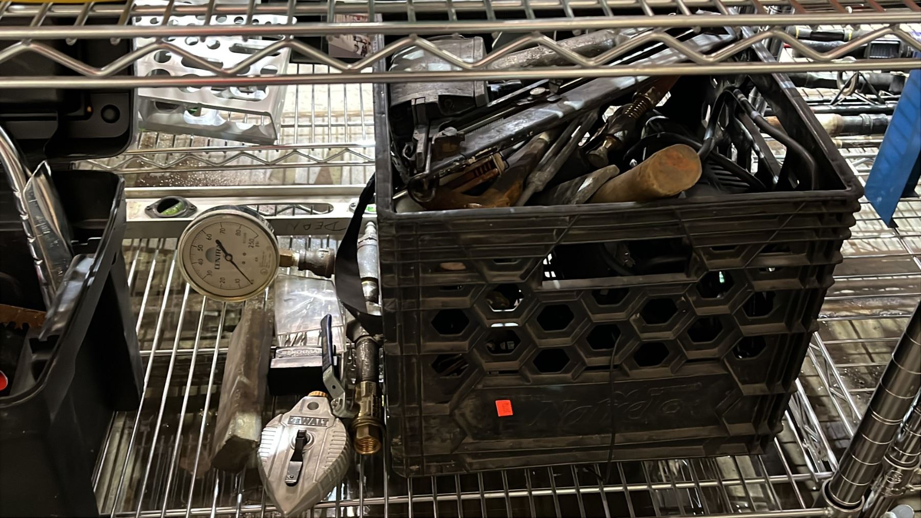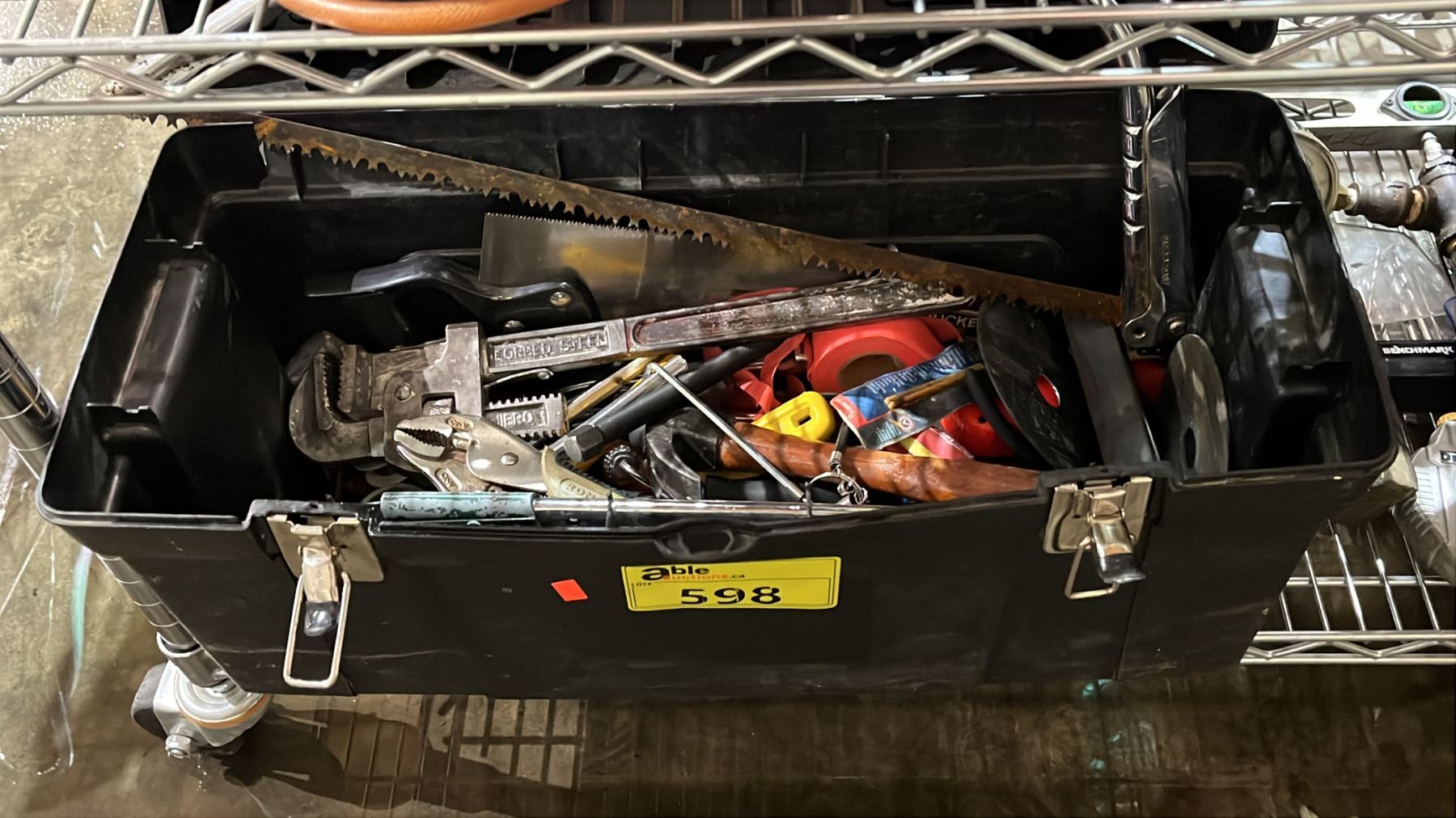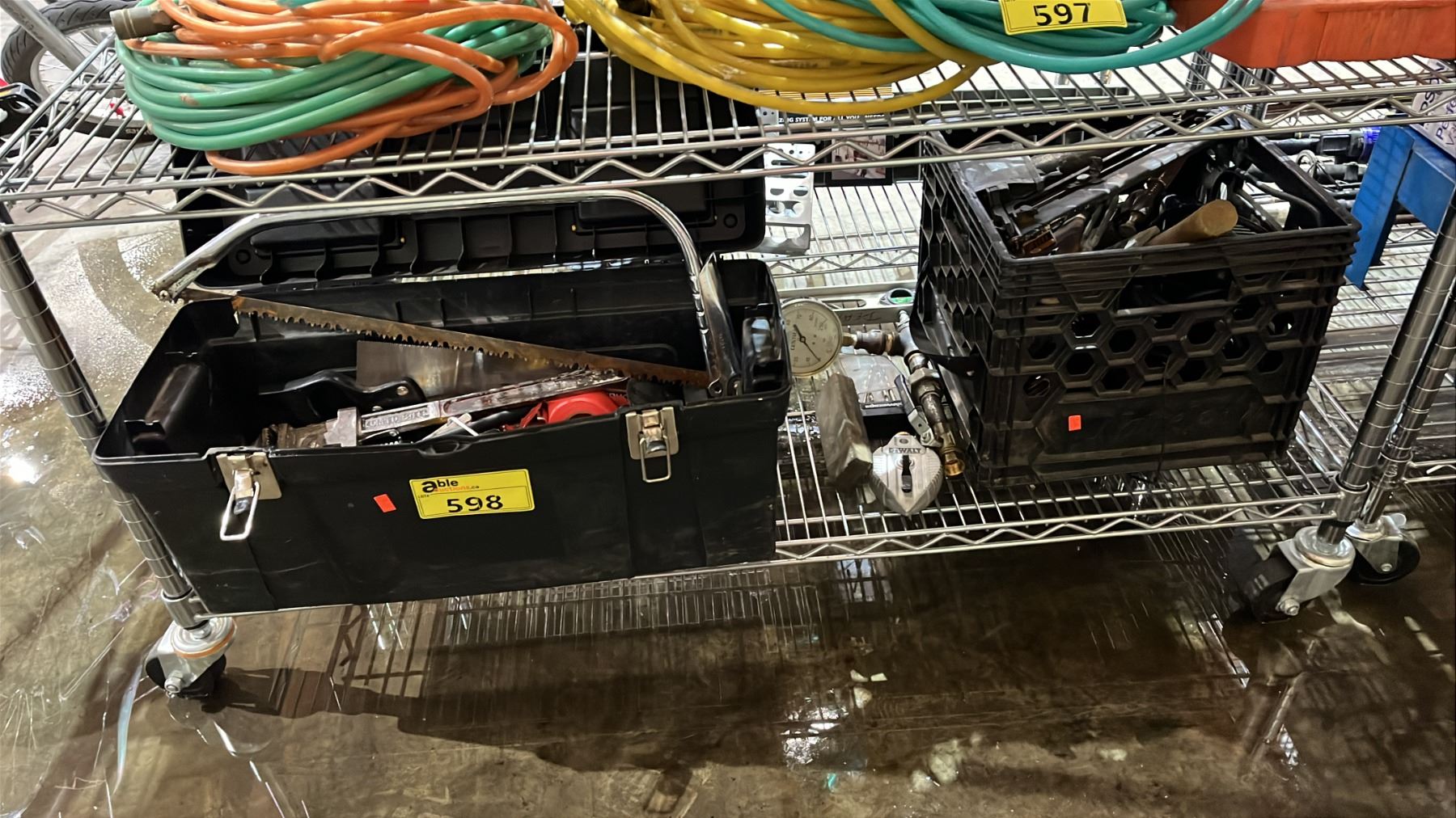 PLASTIC TOOL BOX & MILK CRATE FILLED WITH SMALL HAND TOOLS