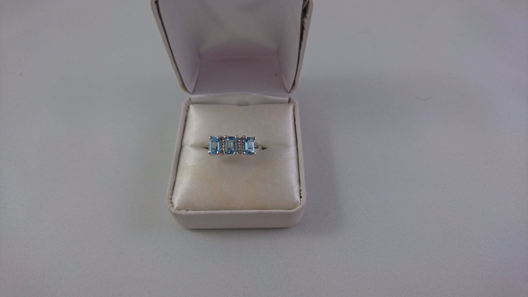 PLATINUM LADIES RING SET WITH THREE OCTAGON PROBABLE AQUAMARINE + 4 SCD TW 4.5 GRAM REPLACEMENT VALUE $2100