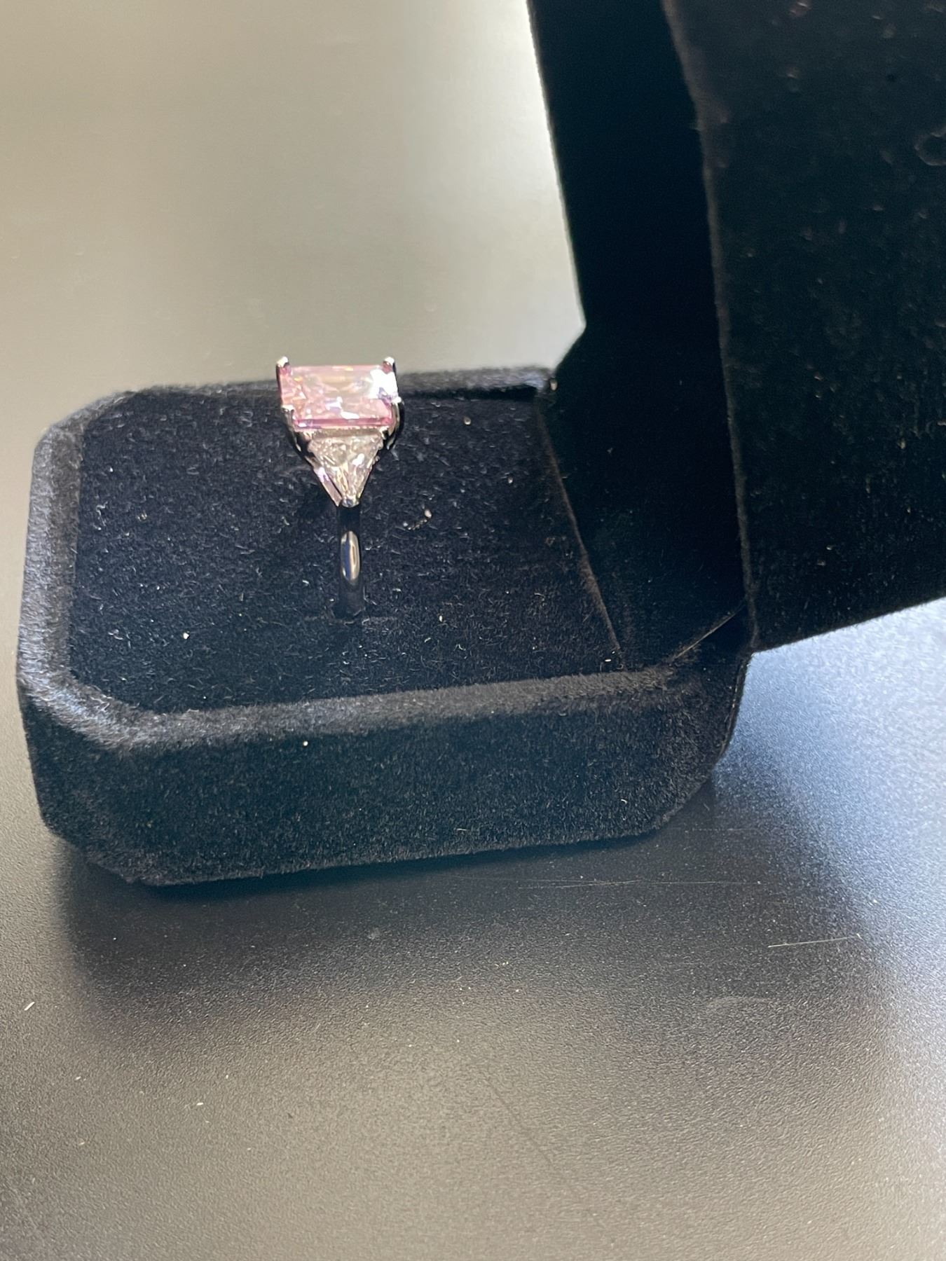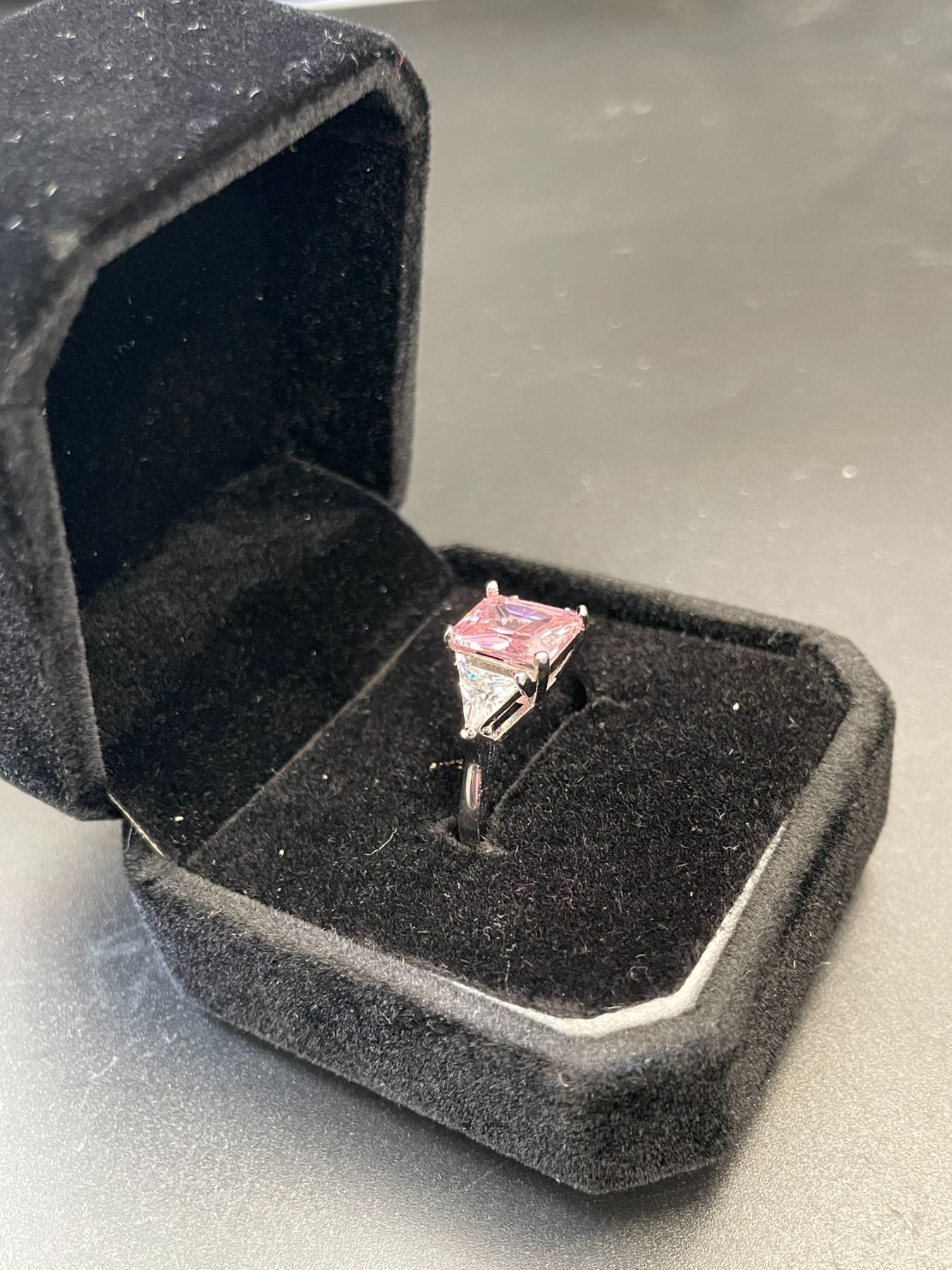 PLATINUM PLATED 3.0CT LAB-CREATED PINK SAPPHIRE TRINITY RING WITH TRILLION SIDE STONES - SIZE 7