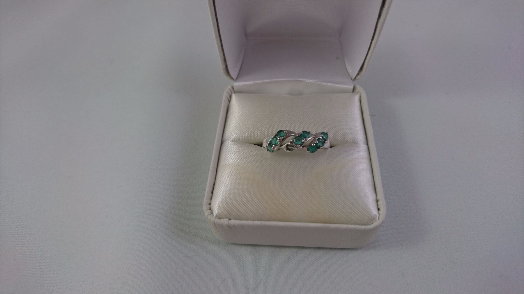 PLATINUM RING SET WITH 8 M-C EMERALDS (ONE MISSING) TE 4 GRAM REPLACEMENT VALUE $625