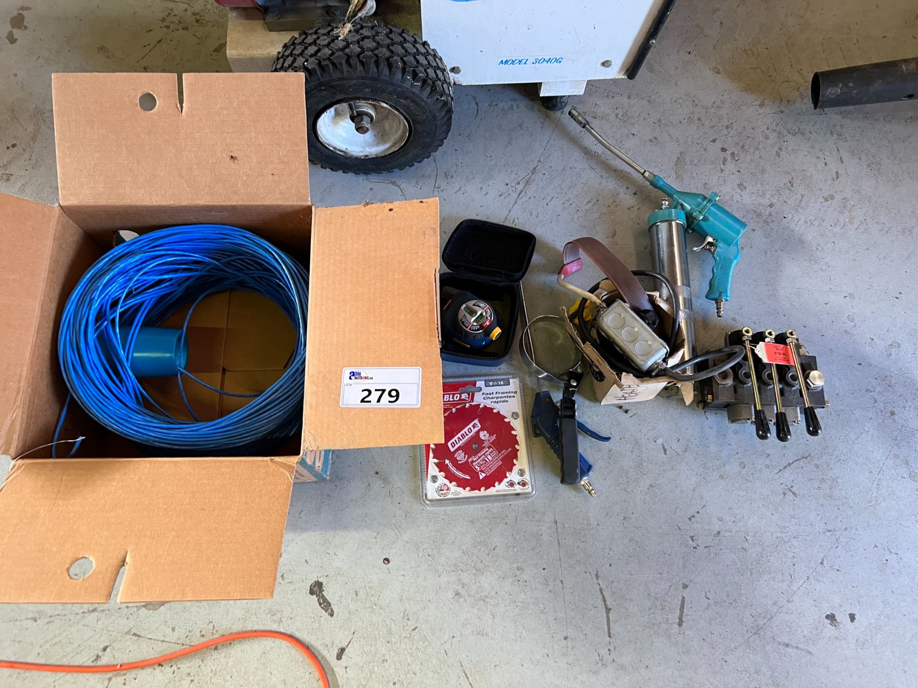 PNEUMATIC GREASE GUN, MINI RYOBI LASER LEVEL, 3-2AY HYDRAULIC VALVE, BRISKHEAT ELECTRIC HEAT TAPE 5.5" SAW BLADE & PART SPOOL OF CAT5