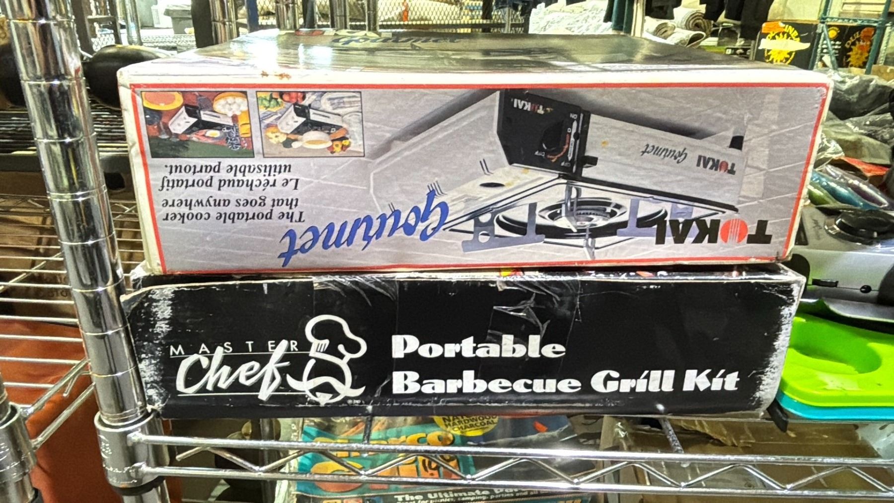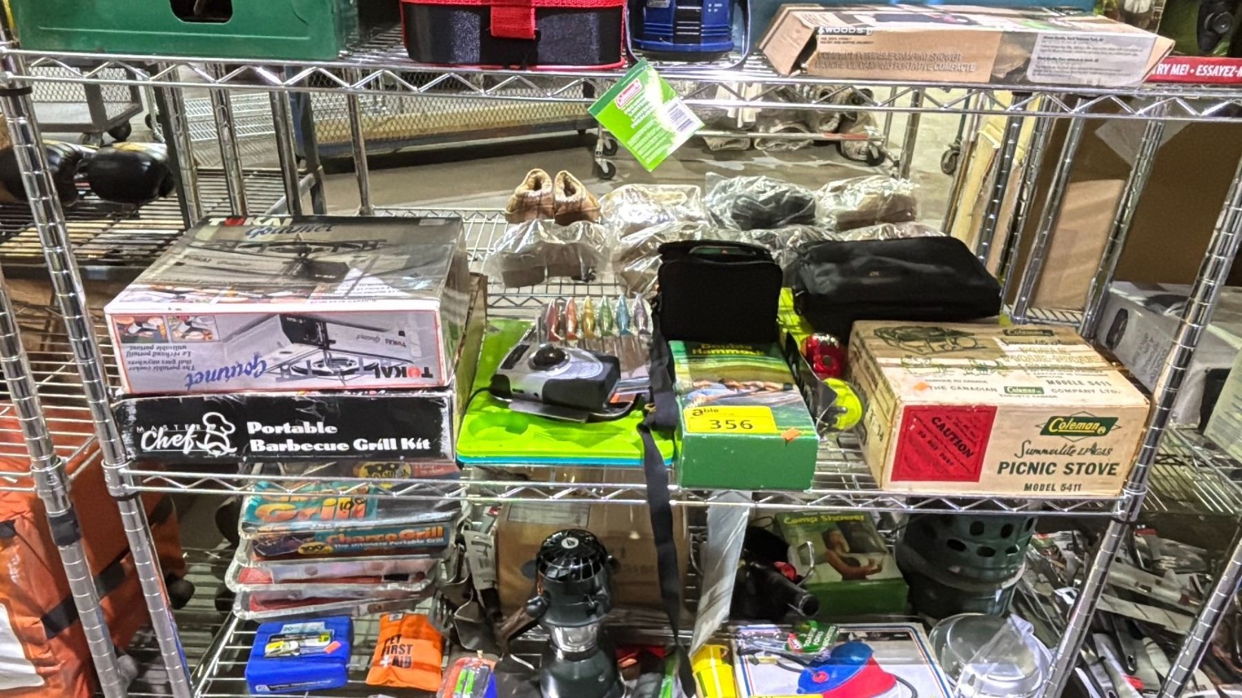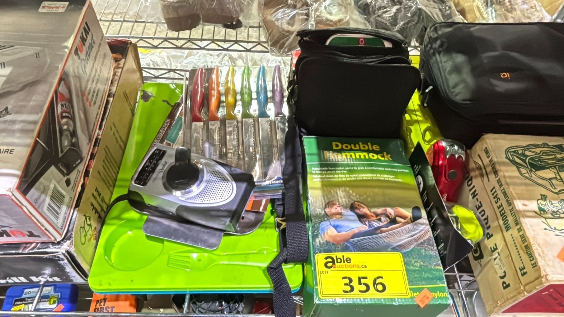 PORTABLE BBQ GRILL KIT, CAMP STOVE, KNIFE SET, DOUBLE HAMMOCK, COLEMAN PICNIC STOVE, METAL FIRST AID BOX & MORE