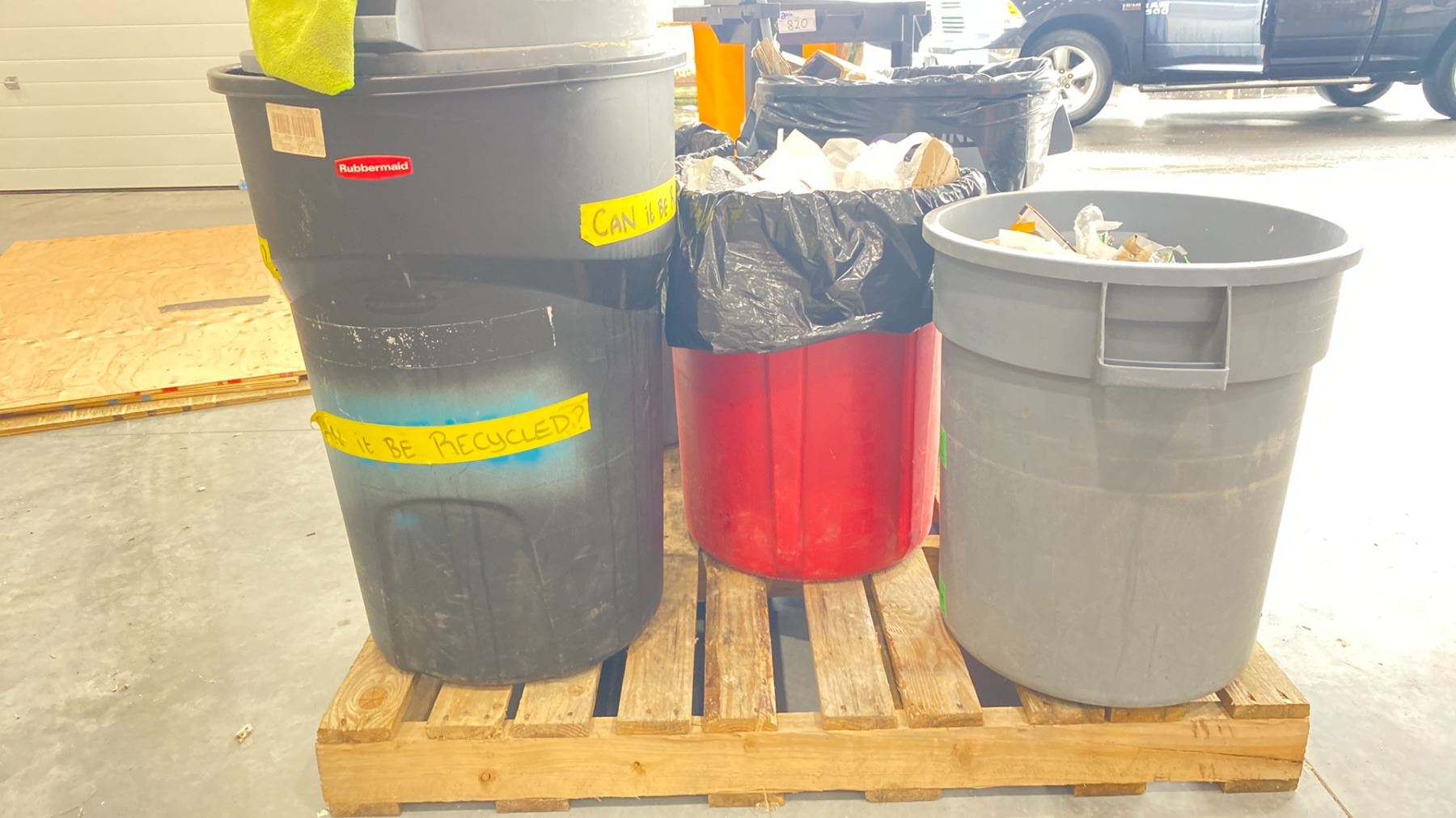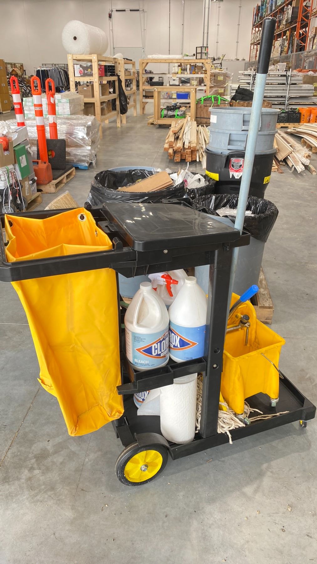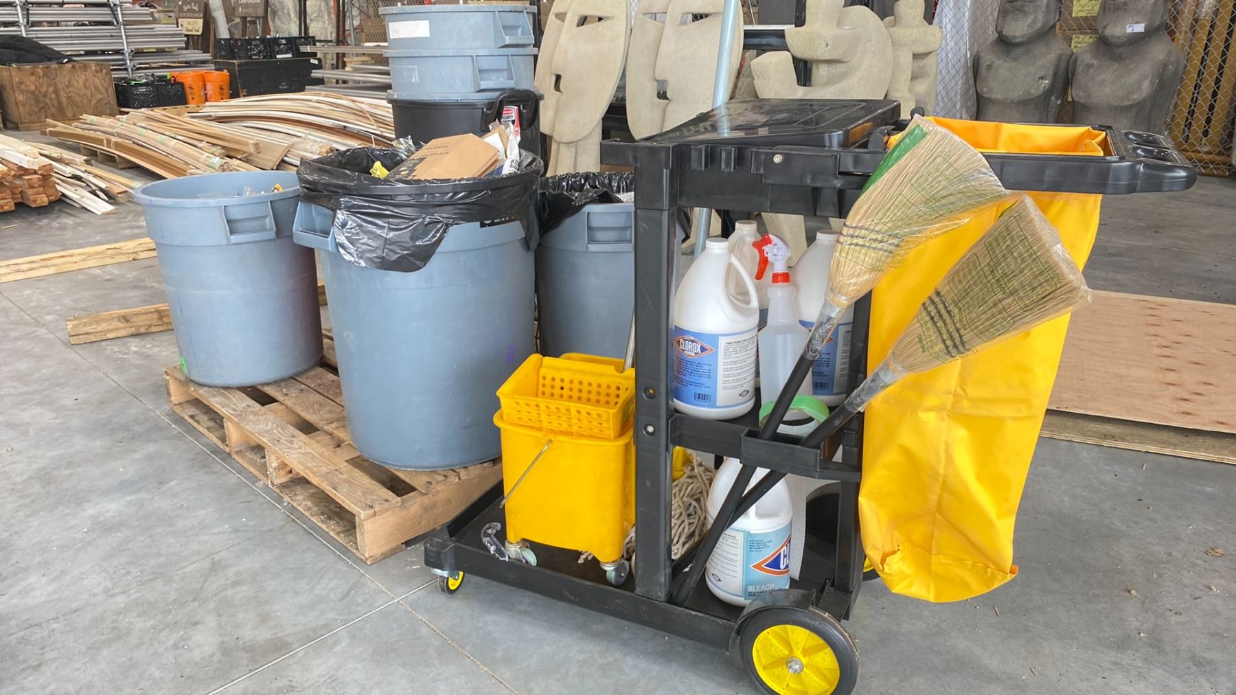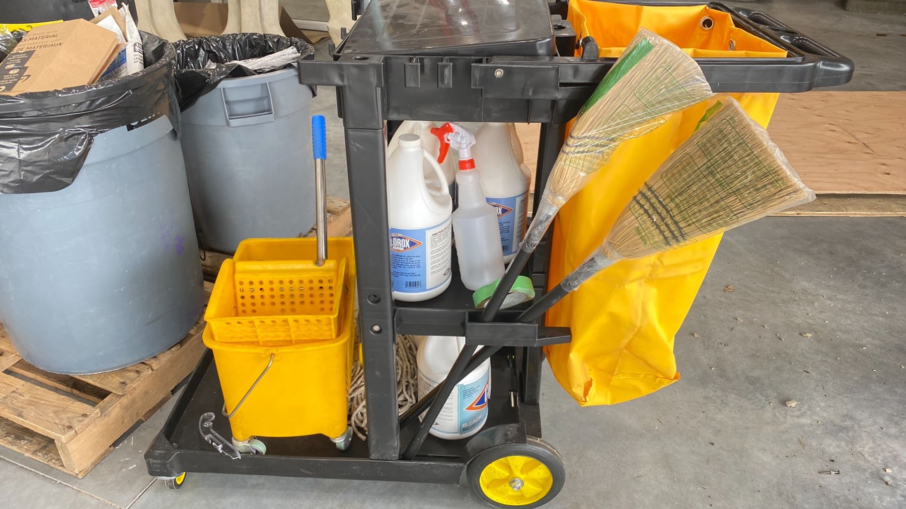 PORTABLE JANITOR'S CART & PALLET OF ASSORTED WASTE BINS (CONTENTS OF WASTE BINS NOT INCLUDED)