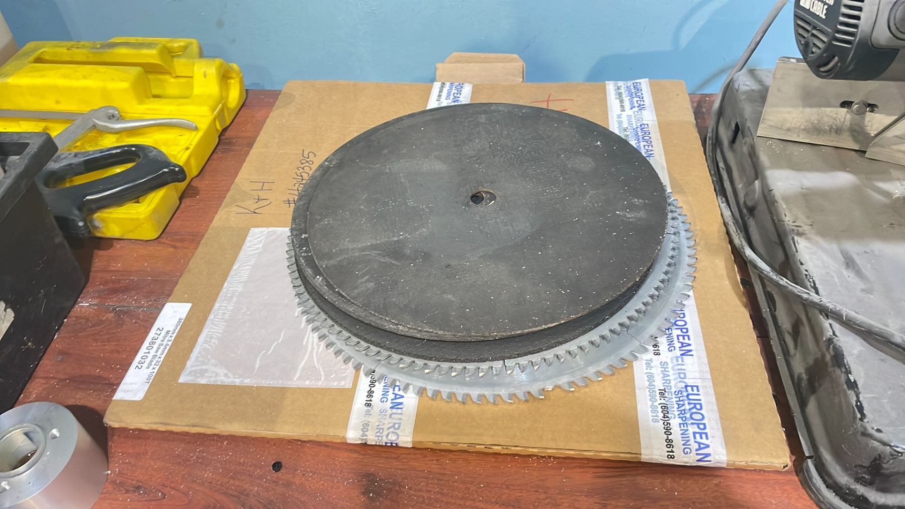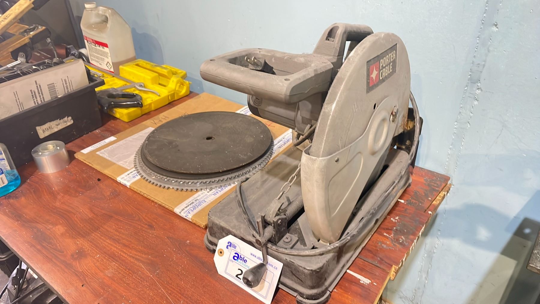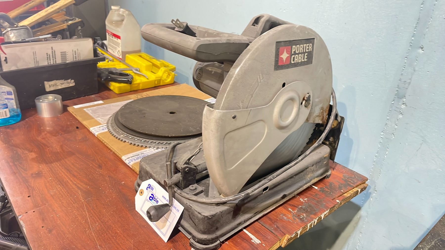 PORTER-CABLE ELECTRIC INDUSTRIAL CHOP SAW WITH VARIOUS WOOD & METAL CUTTING SAW BLADES