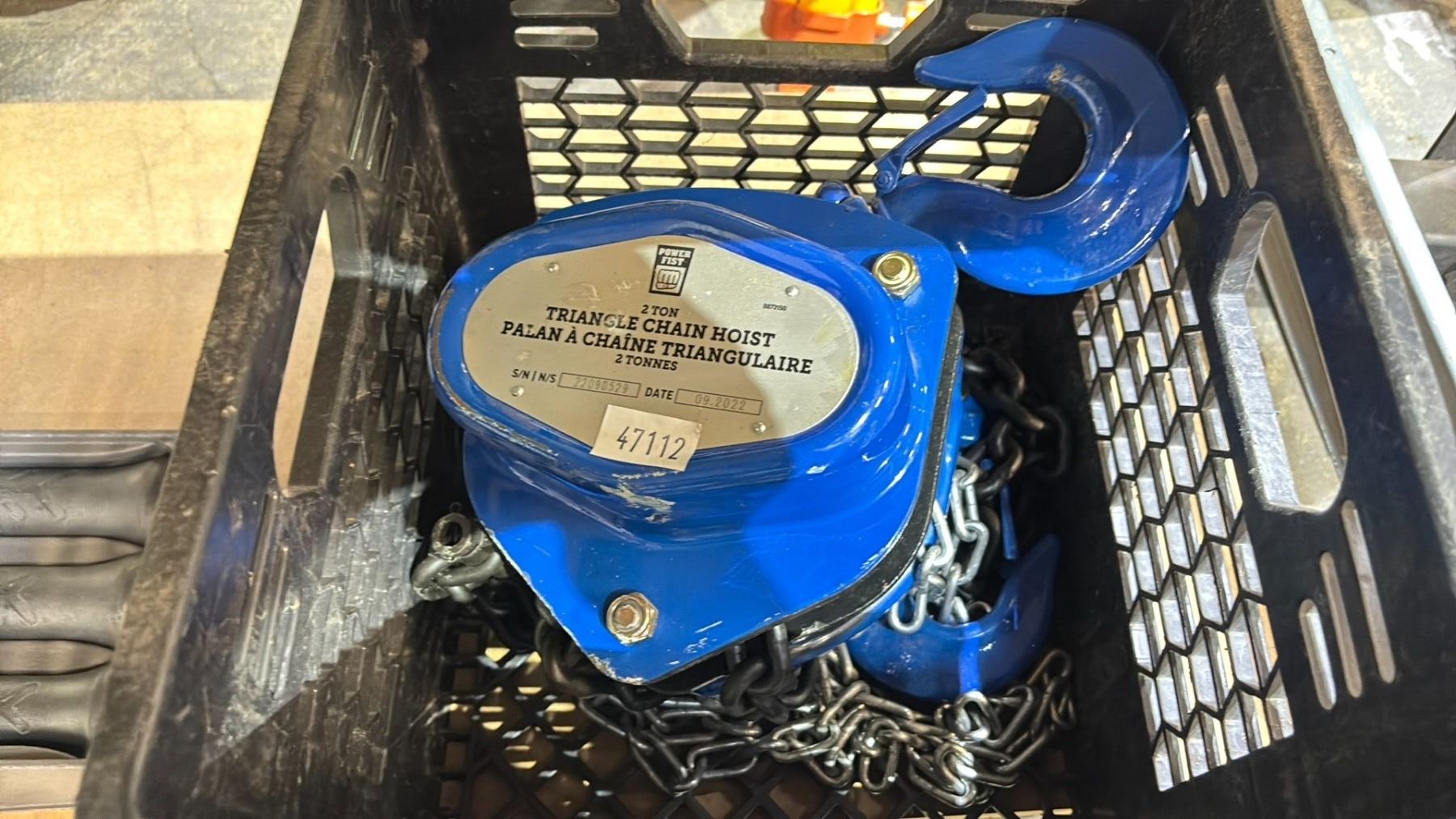 POWER FIST 2 TON TRIANGLE CHAIN HOIST WITH CHAIN IN A MILK CRATE