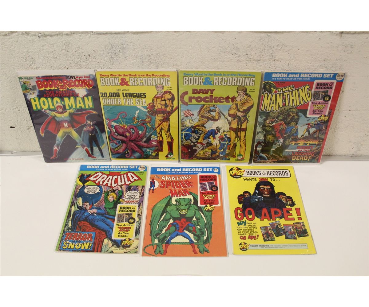 POWER RECORD COMICS BRONZE AGE BOOK & RECORD SET. 7 DIFFERENT, 4 HAVE RECORDS, THE 3 MARVEL COPIES DO NOT HAVE RECORDS. MIXED GRADES, SOLID LOT.