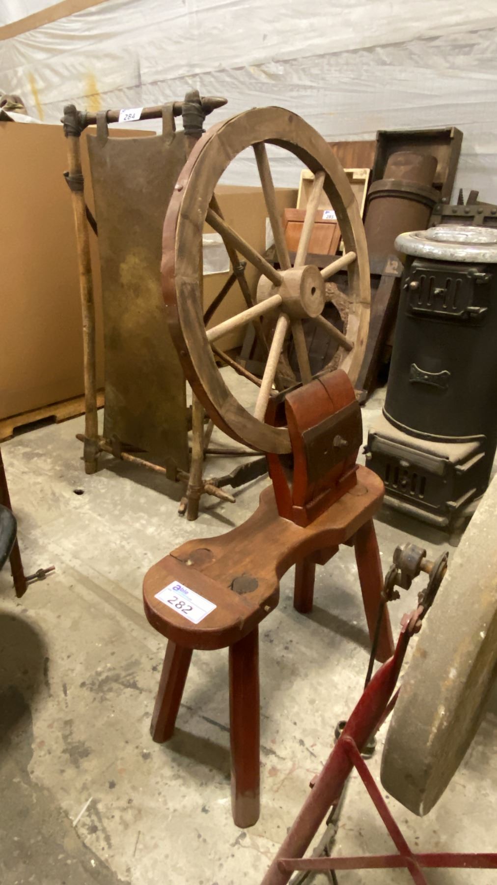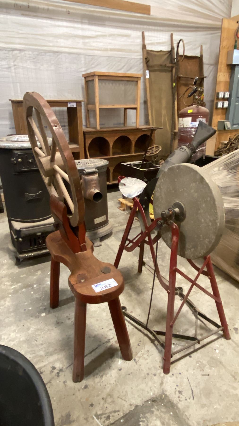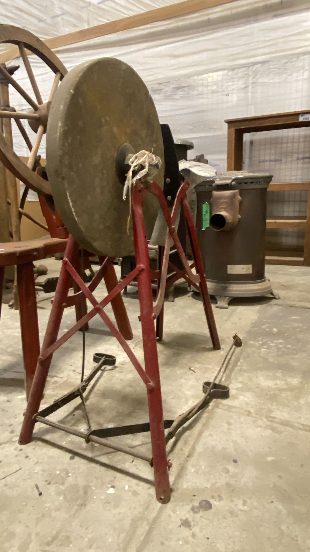 PRIMITIVE WOODEN WOODWORKERS CLAMP & METAL FRAMED GRINDING WHEEL