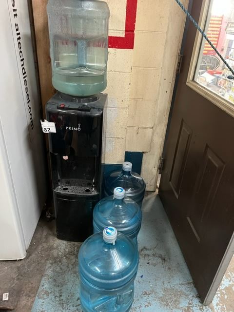 PRIMO WATER COOLER WITH 4 JUGS- 2 ARE FULL. HOT AND COLD WATER.