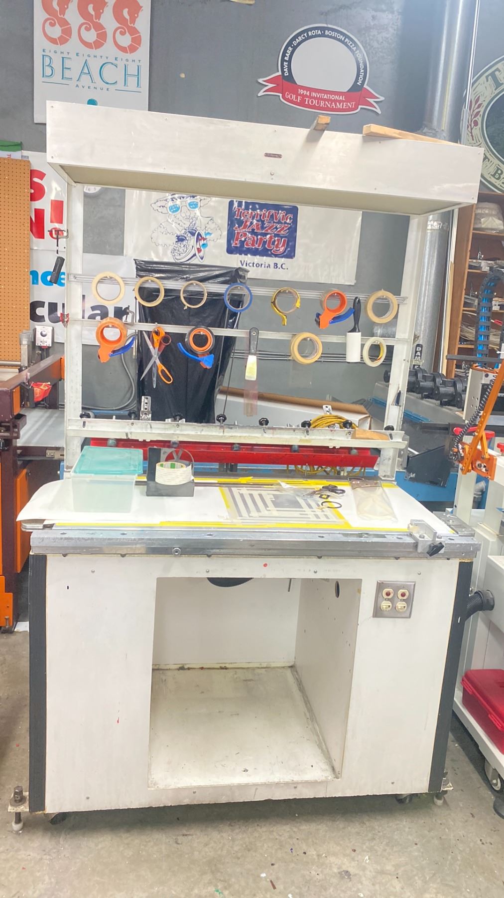 PRINT SHOP LIGHTED MOBILE WORK TABLE WITH ASSORTED MISCELLANEOUS ITEMS