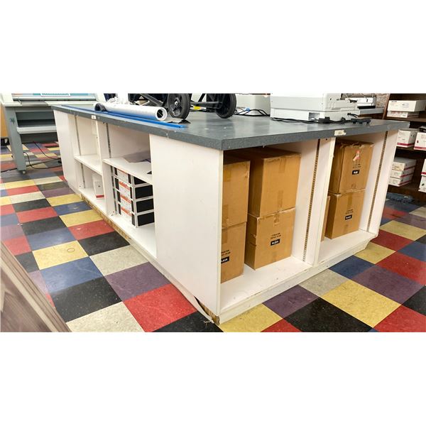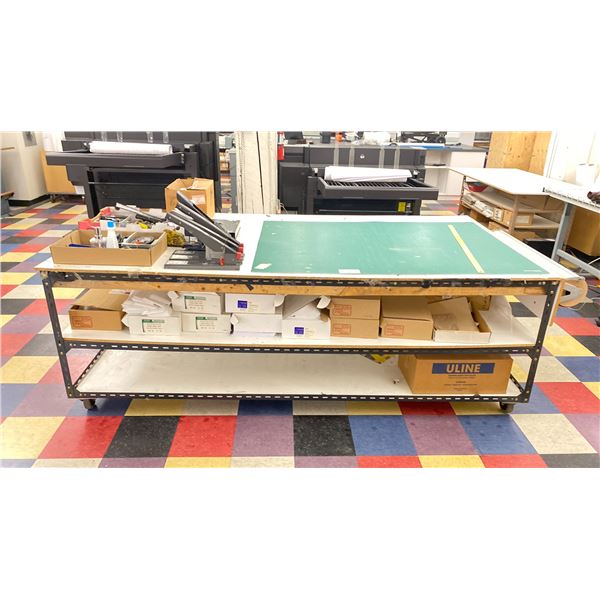 WHITE WOODEN / METAL 97"W X 49"D X 33 1/2"H COMMERCIAL MOBILE LAYOUT TABLE WITH ASSORTED PRINT SHOP CONTENTS