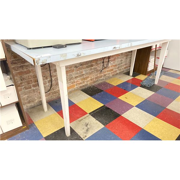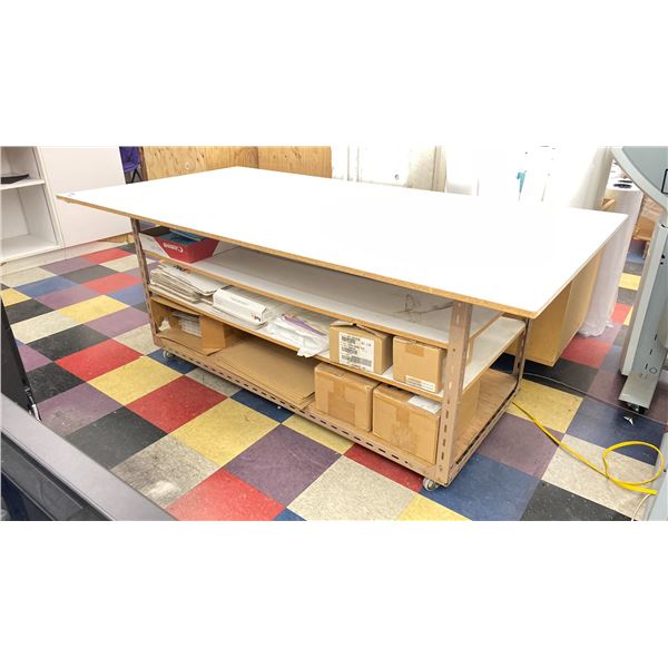 WHITE WOODEN / METAL 97"W X 49"D X 33 1/2"H COMMERCIAL MOBILE LAYOUT TABLE WITH ASSORTED PRINT