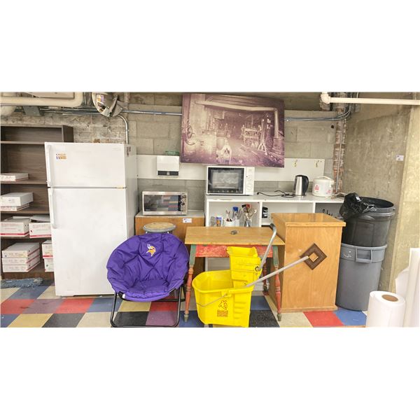 CONTENTS OF BACK OFFICE INCLUDING: METAL 2 DOOR STORAGE CABINET, 2 OFFICE CHAIRS, 2 DESKS, ASSORTED SHELVING, MICROFICHE, & VARIOUS ELECTRONICS