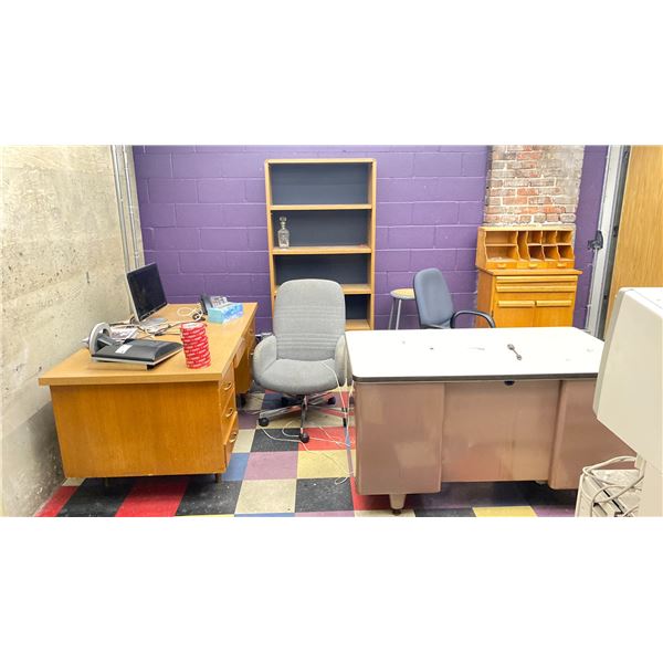 CONTENTS OF BACK OFFICE INCLUDING: METAL 2 DOOR STORAGE CABINET, 2 OFFICE CHAIRS, 2 DESKS, ASSORTED