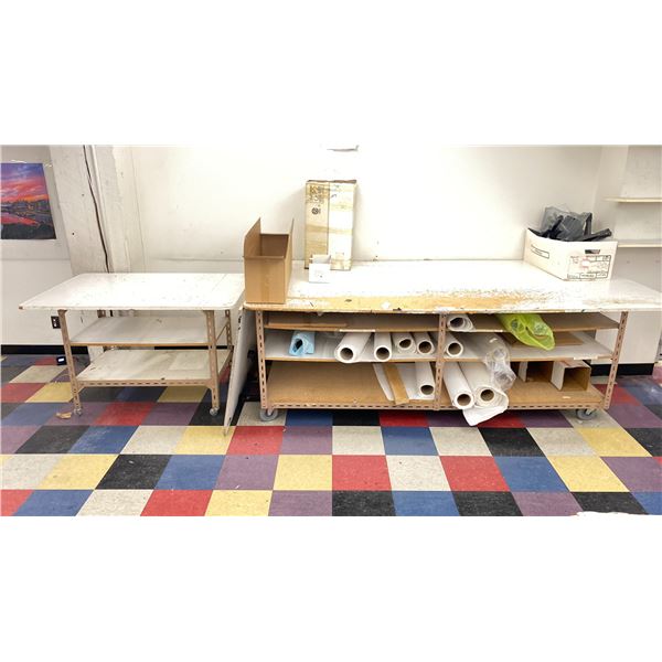2 WHITE WOODEN / METAL COMMERCIAL MOBILE LAYOUT TABLES WITH ASSORTED PRINT SHOP CONTENTS: