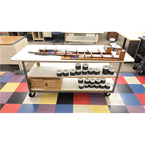 WHITE WOODEN / METAL 73"W X 29"D X 32"H COMMERCIAL MOBILE LAYOUT TABLE WITH PRINT SHOP ROLL SPINE FOLDING JIGS & ASSORTED SPINE R...