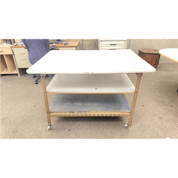 WHITE WOODEN / METAL 50"W X 38"D X 33 1/2"H COMMERCIAL MOBILE LAYOUT TABLE