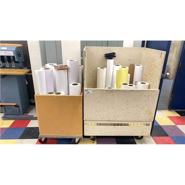 2 LARGE MOBILE COMMERCIAL PAPER TRANSPORT BINS WITH ASSORTED ROLL STOCK PAPER *BINS INCLUDED*