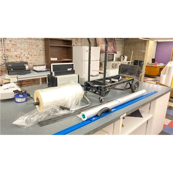 LARGE PLASTIC ROLL ON DISPENSER, BLACK 4 WHEEL CONVERTIBLE HAND TRUCK, & ASSORTED PRINT SHOP TOOLS
