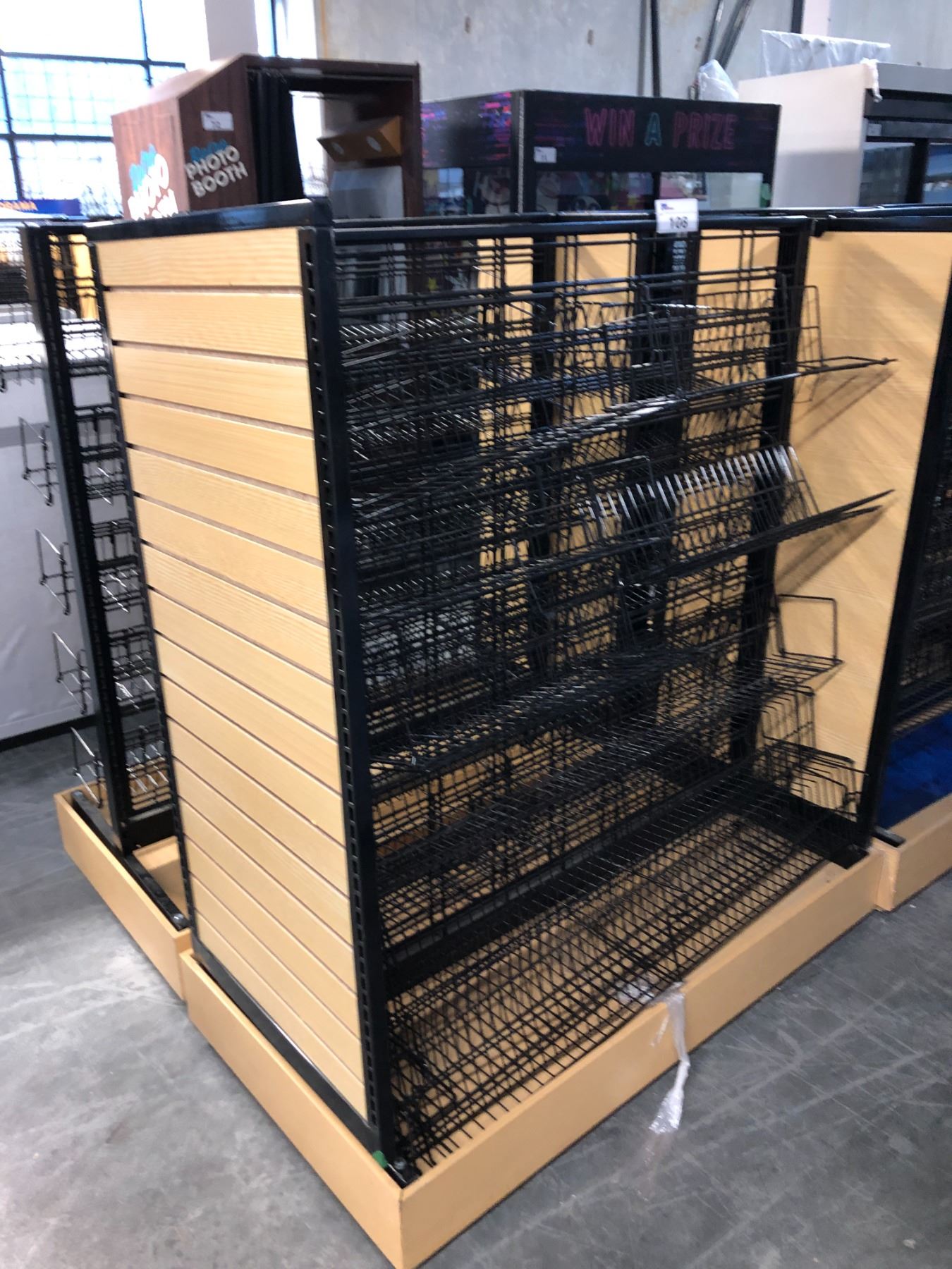 PROP LOT OF 2 ASSORTED LIGHT WOOD/BLACK METAL MOBILE COMMERCIAL DISPLAY RACKS