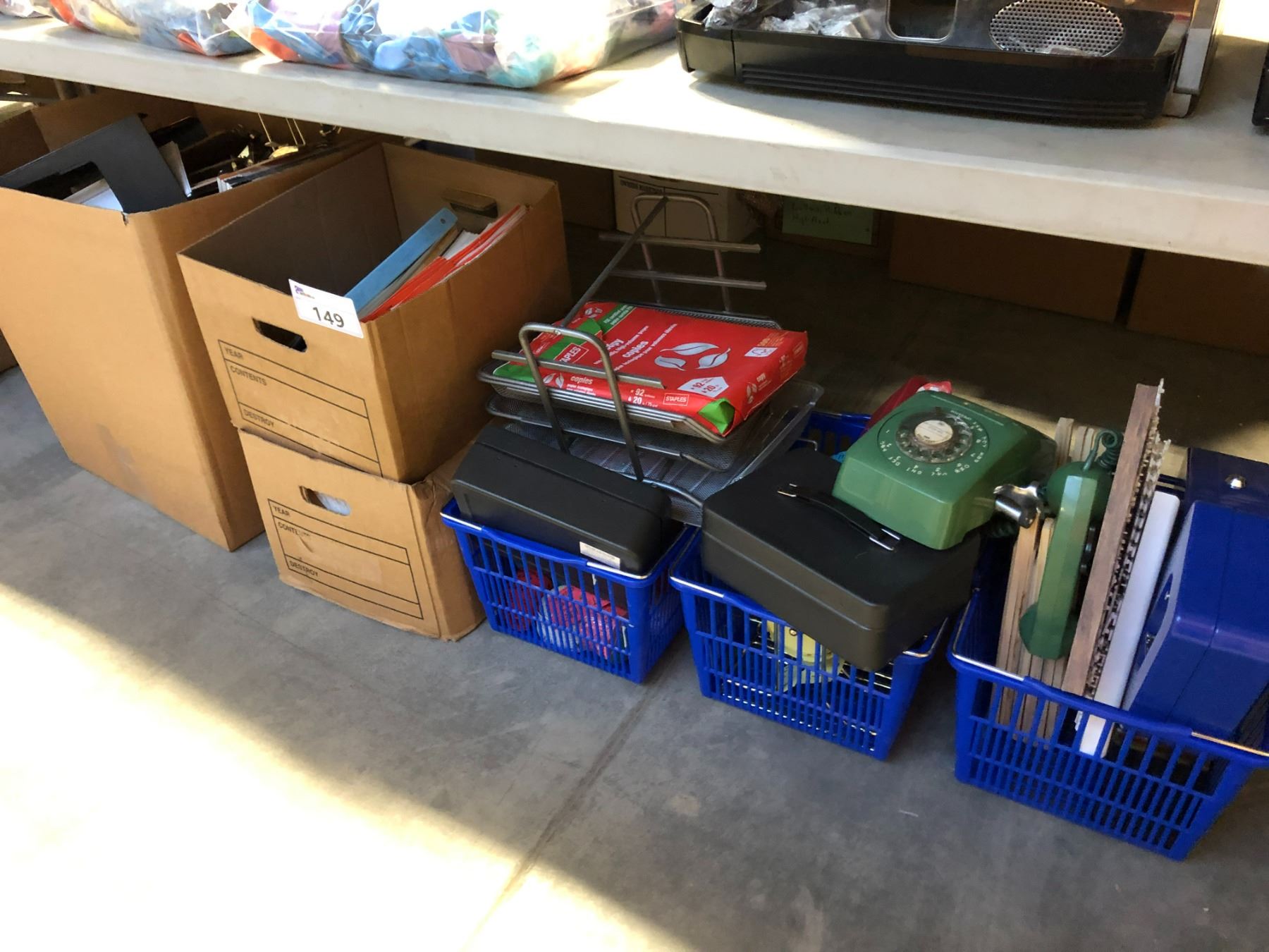 PROP LOT OF 6 BOXES OF ASSORTED OFFICE SUPPLIES, RAFFLE TICKETS AND CASH BOXES