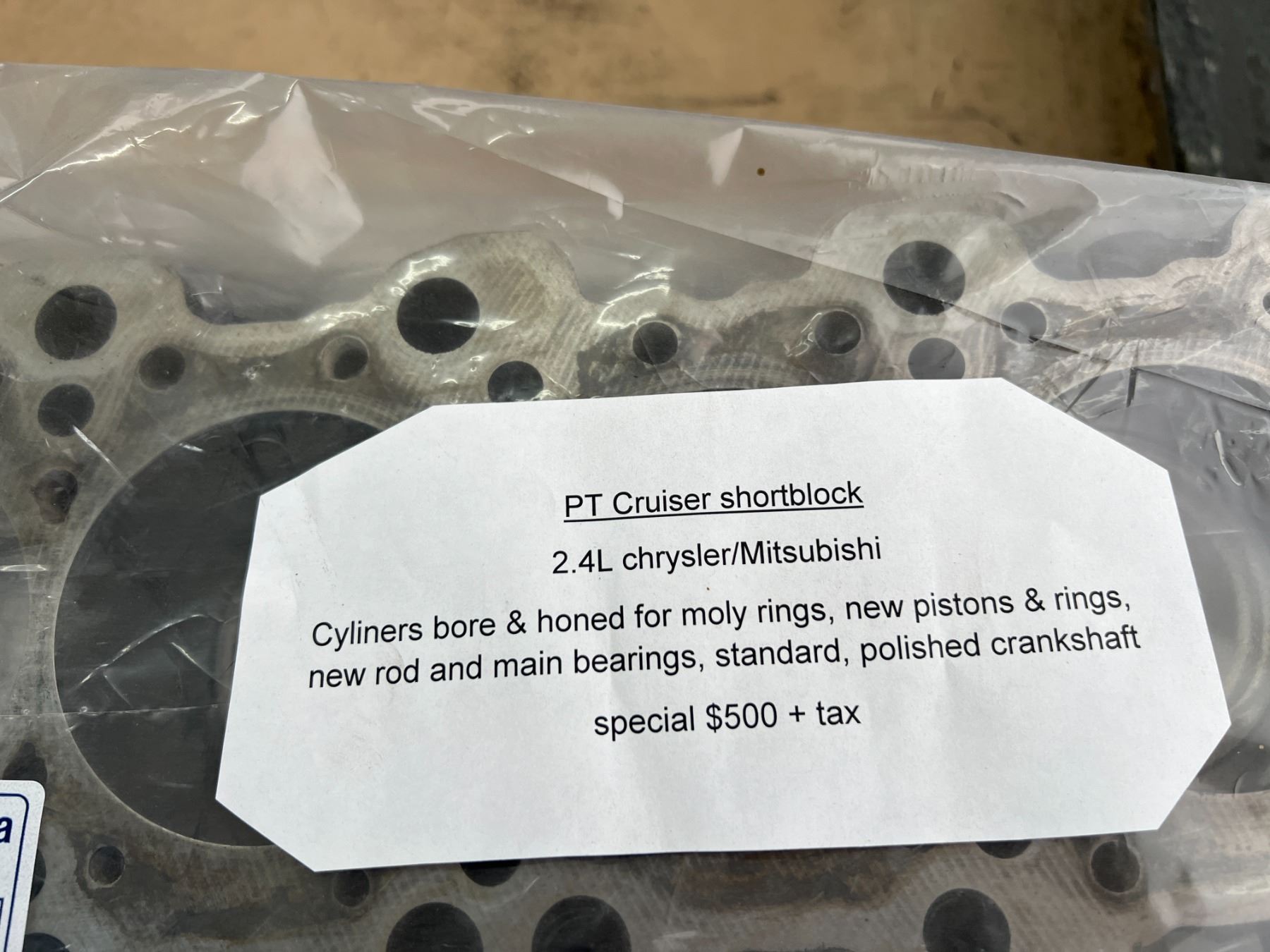 PT CRUISER SHORTBLOCK 2.4L CHRYSLER/MITSUBISHI. CYLINDERS BORE AND HONED FOR MOLY RINGS, NEW PISTONS & RINGS, NEW ROD AND MAIN BEARINGS, STANDARD, POLISHED CRANKSHAFT