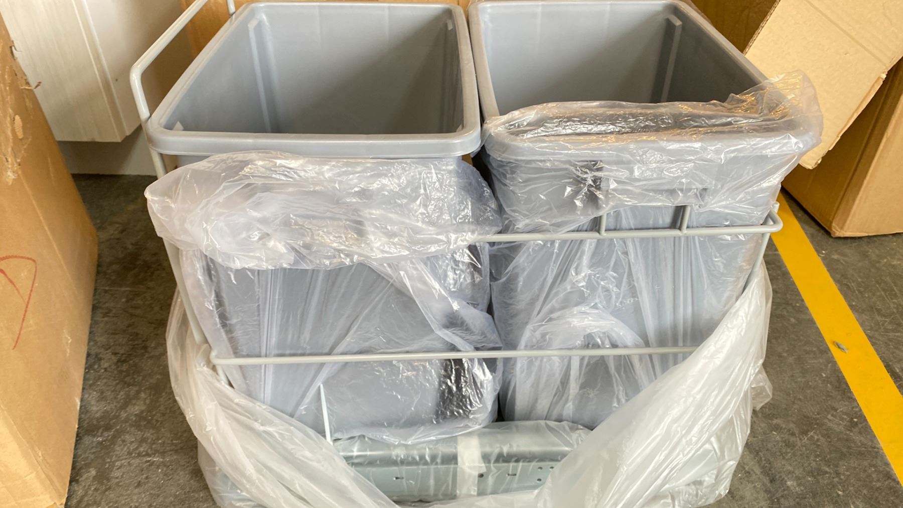 PULL OUT GARBAGE/RECYCLE BINS FOR 15 INCH CABINET.