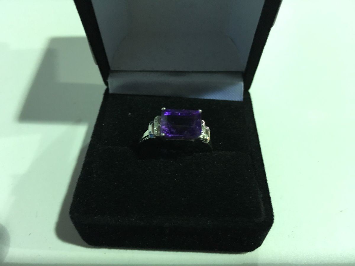 PURPLE AMETHYST COCKTAIL RING SET WITH 2 DIAMONDS STERLING SILVER WITH PLATINUM OVERLAY RETAIL: $300.00