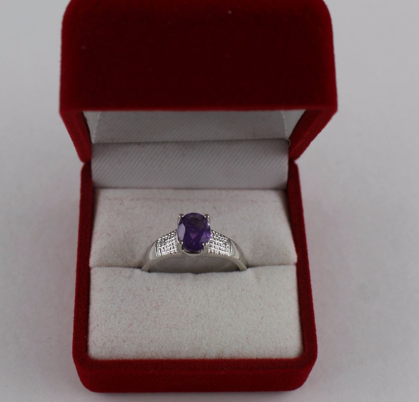 PURPLE AMETHYST & DIAMOND RING, OVAL CUT 2 SHOULDER DIAMONDS STERLING SILVER