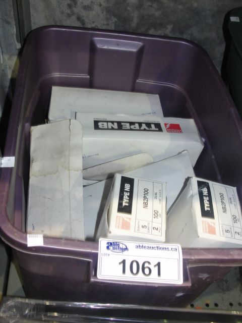 PURPLE RUBBERMAID CONTAINER FILLED WITH RESIDENTIAL CIRCUIT BREAKER SWITCHES
