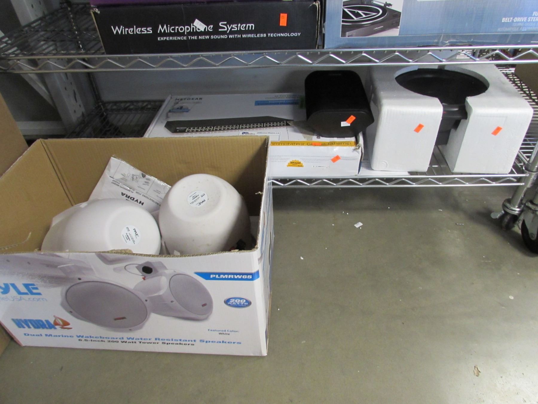PYLE DUAL MARINE WAKEBOARD WATER RESTRAINT SPEAKERS, NETGEAR ETHERNET SWITCH, SUBWOOFER & SPEAKER