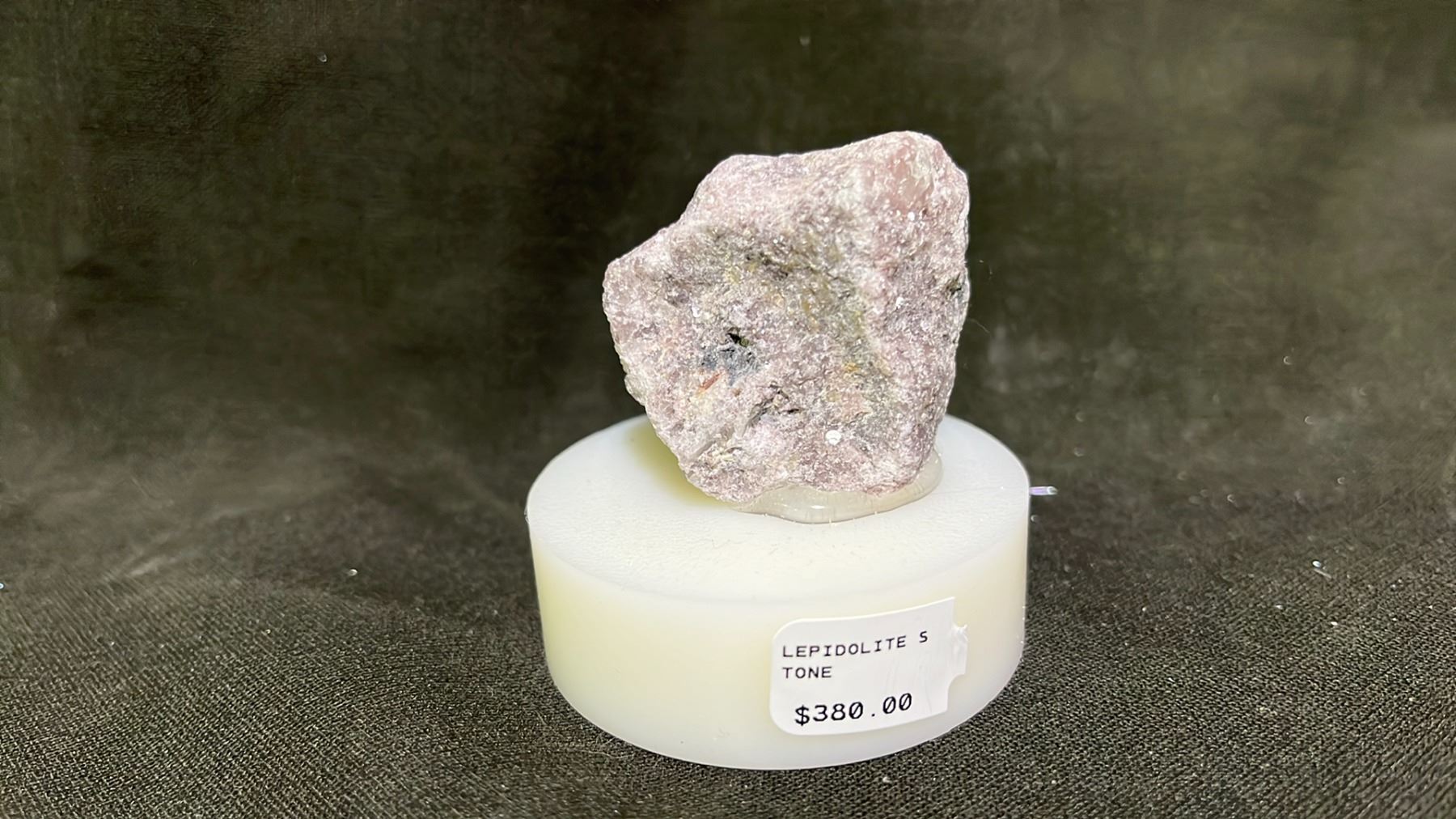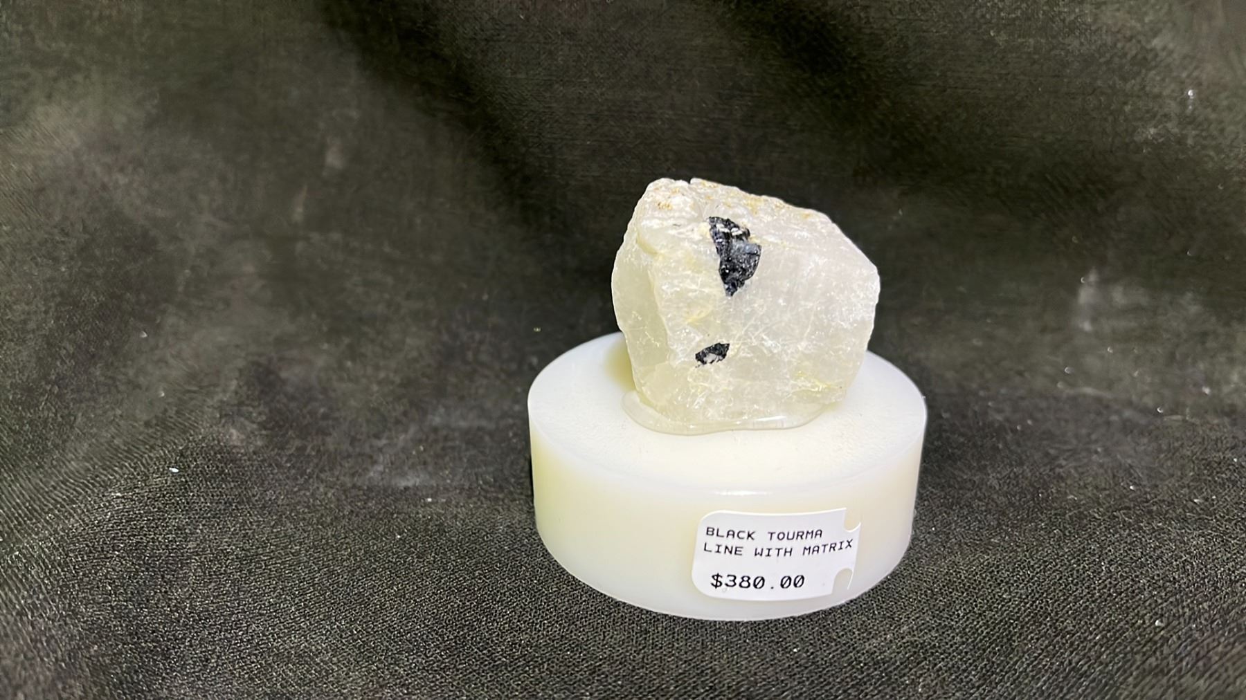 PYRITE AND FLOWER CALCITE RETAIL $380, BLACK TOURMALINE WITH MATRIX RETAIL $380, LEPIDOLITE STONE RETAIL $380