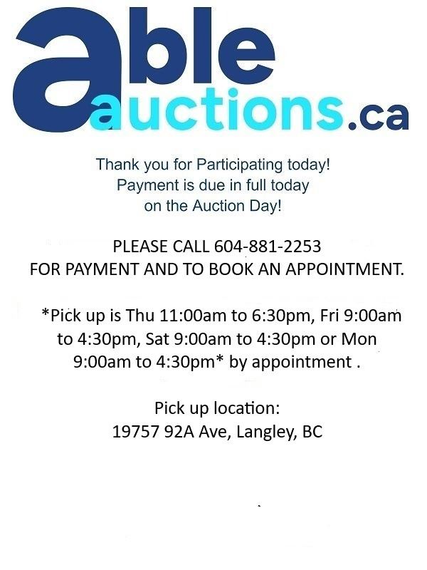 Payment is due in full today. You can authorize us via email or calling 604-325-2253 we can directly charge your Visa or MC on file for any purchases under $999. *Please note we will need to have a verbal confirmation of the last 4 digits of your credit card to process the payment* For e-transfers please email them to payment@ableauctions.ca Payment is online only. Payments for invoices over $999.00 we will need to have an e transfer, wire or direct deposit. Please call to book an appointment for pickup. *Please make sure you are able to make your scheduled pick up time. Pickup is by appointment Wed Aug 13 11am - 6:30pm or Thur Aug 14-Sat Aug 16 9AM - 4:30 pm