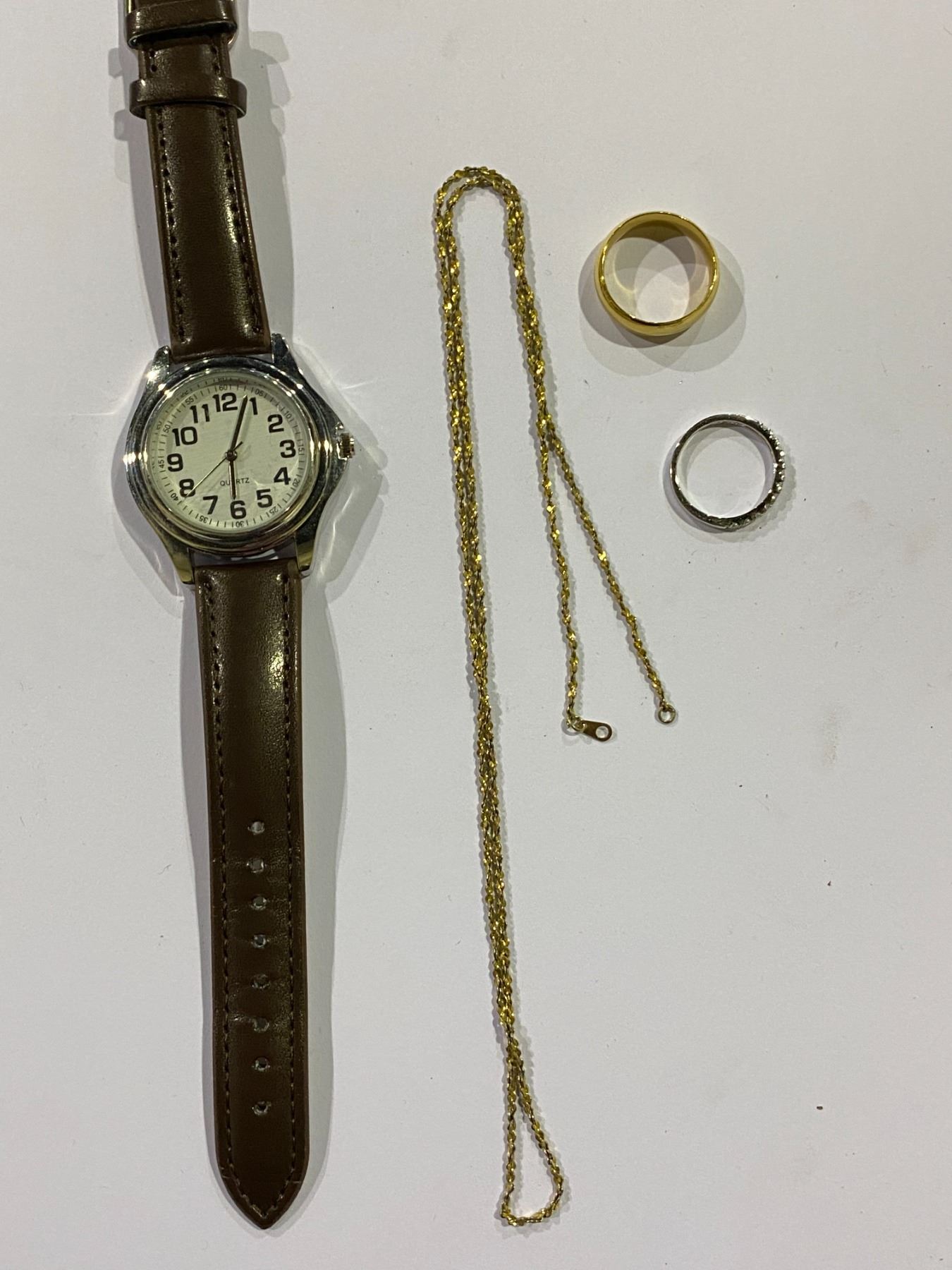 QUARTZ WATCH, 2 RINGS, NECKLACE