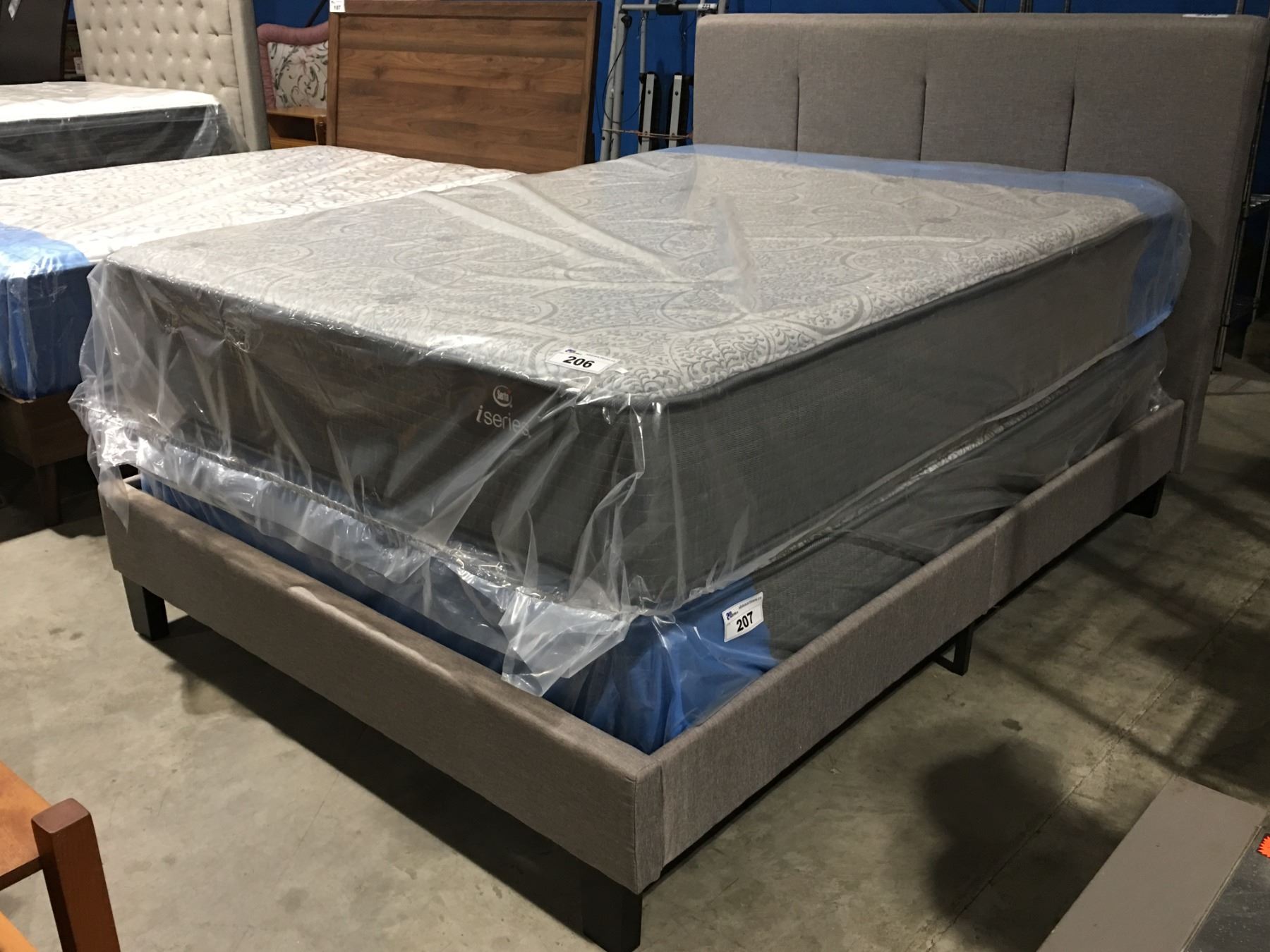 QUEEN SIZE GREY UPHOLSTERED BED (HEADBOARD, FOOTBOARD & RAILS)