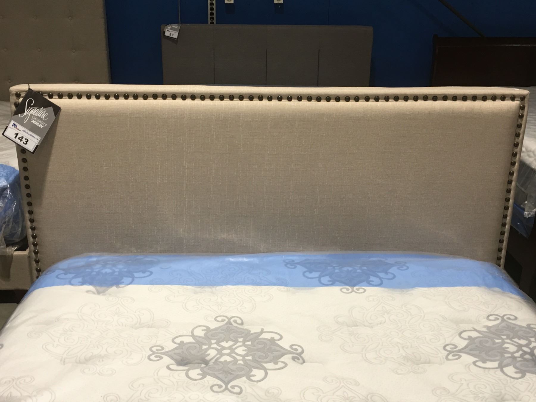 QUEEN SIZE LIGHT BEIGE UPHOLSTERED METAL STUDDED HEADBOARD WITH METAL ROLLER FRAME (FITS QUEEN/DOUBLE MATTRESS)