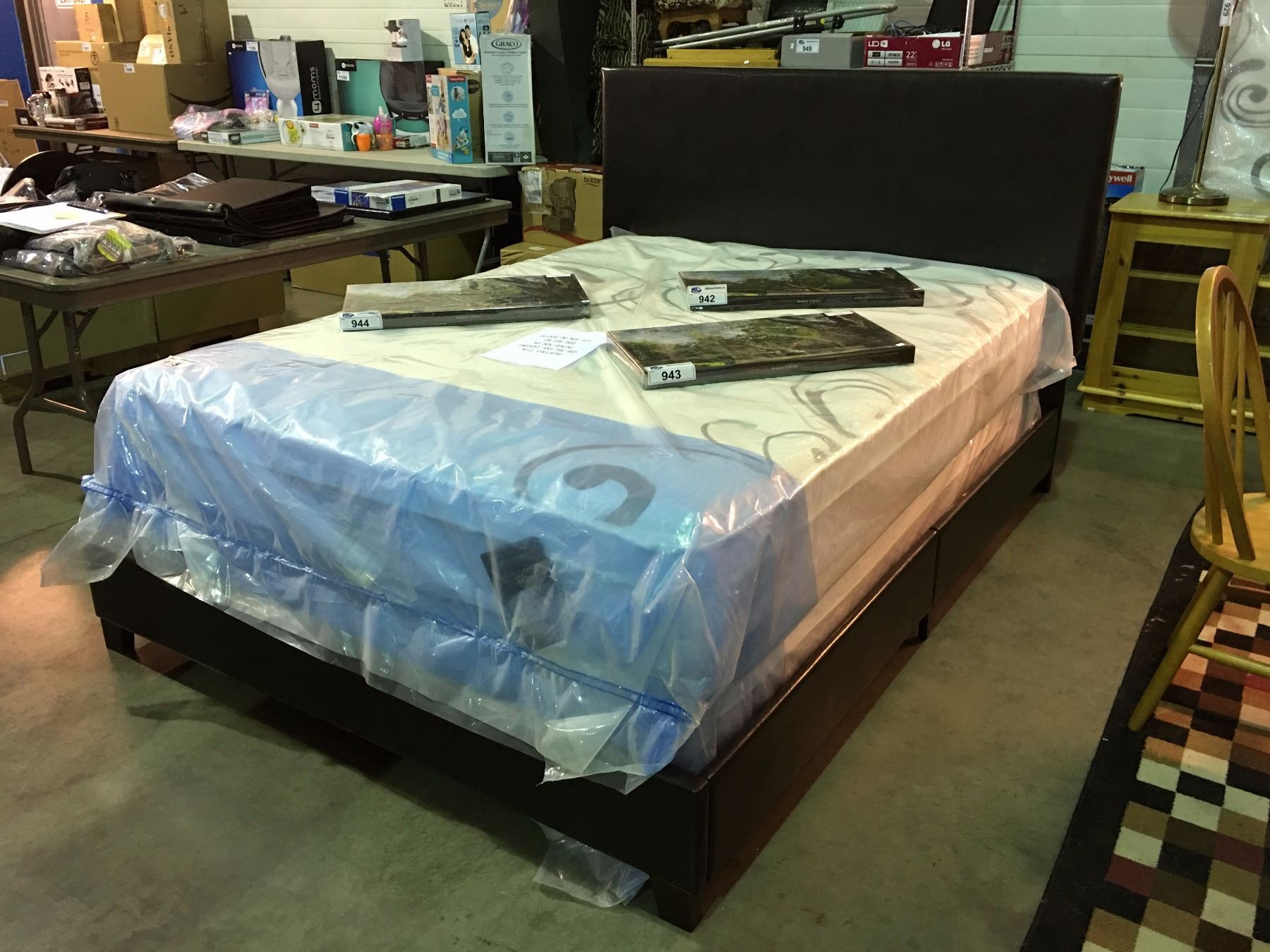 QUEEN SIZED BROWN LEATHER BED - HEADBOARD, FOOTBOARD & RAILS