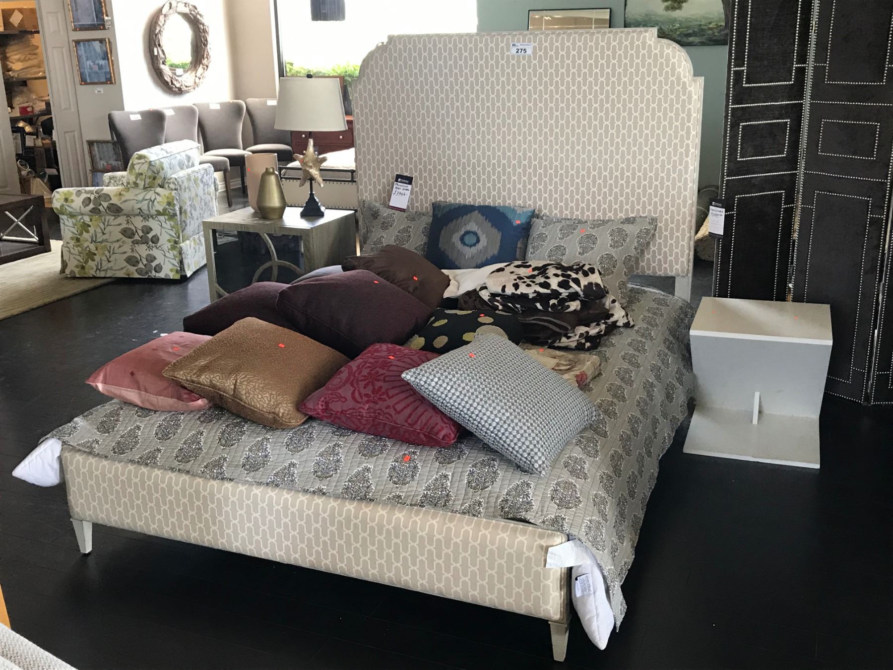 QUEEN SIZED PILLOW BACK FABRIC HEADBOARD BED WITH NIGHT STAND, MATTRESS, BLANKETS & THROW PILLOWS