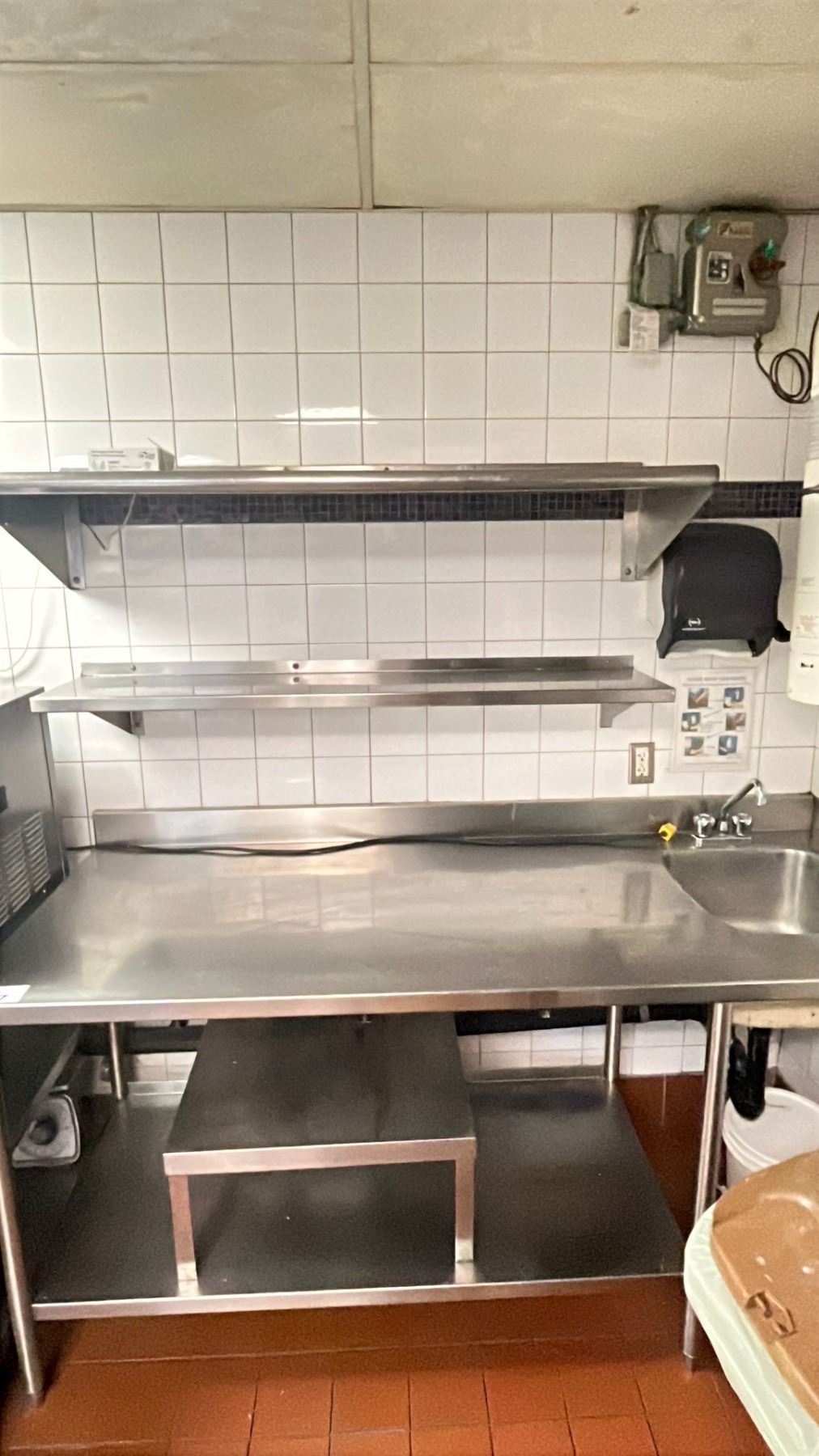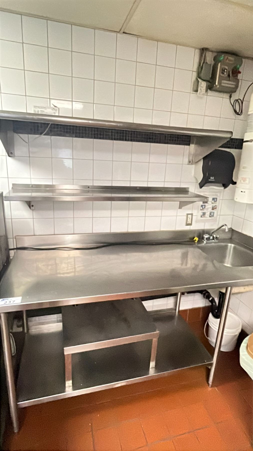 QUEST COMMERCIAL STAINLESS STEEL PRED TABLE WITH SINK AND 2 WALL MOUNT SHELVES TABLE 75" ACROSS X 30" WIDE X 36" HIGH, SHELVES MEASURES 56" ACROSS X 12" & 16" DEEP