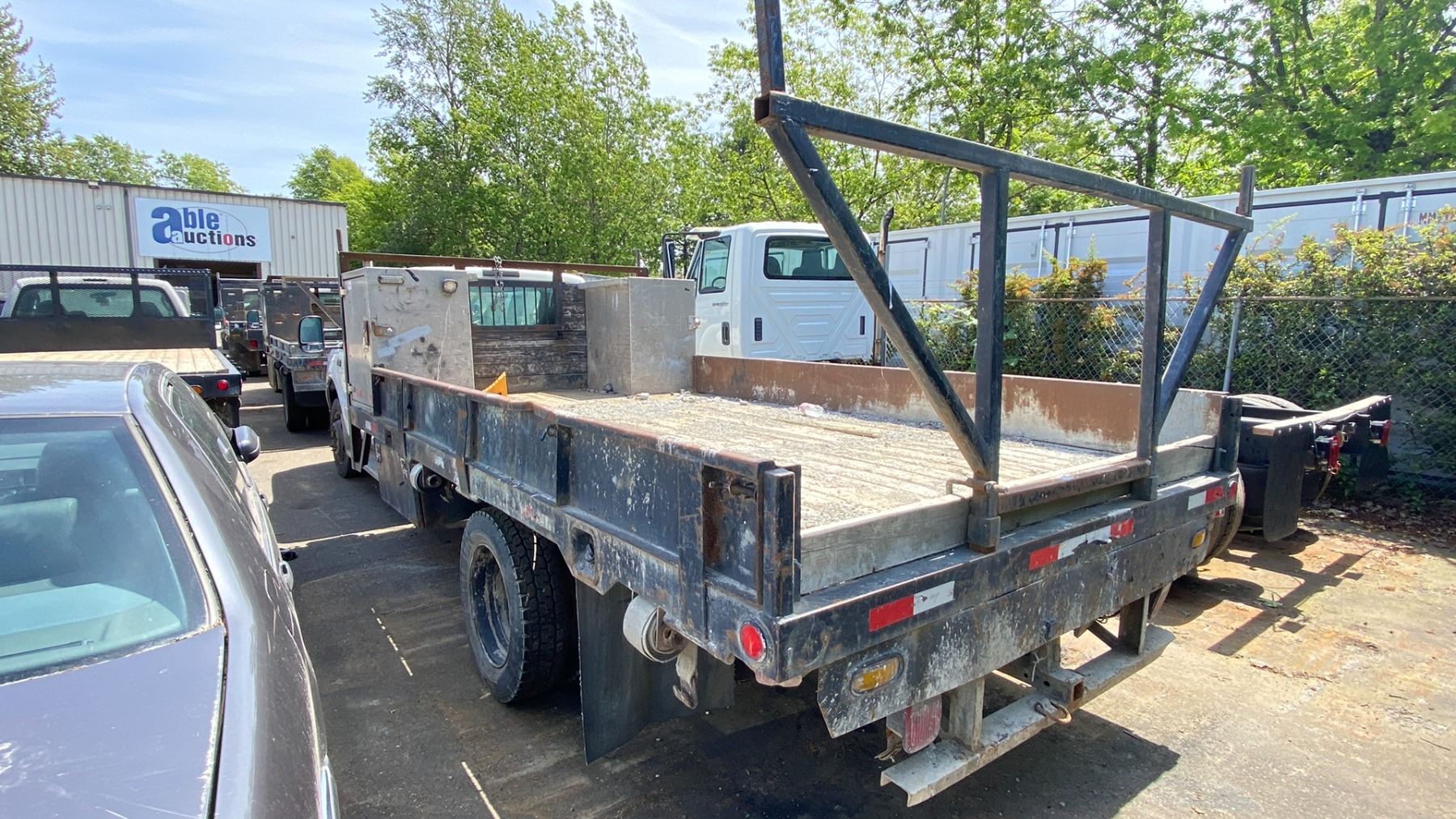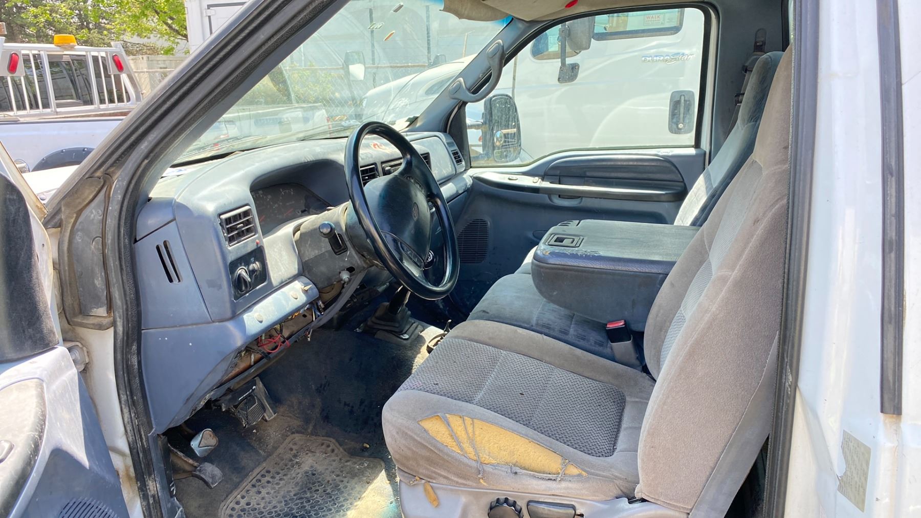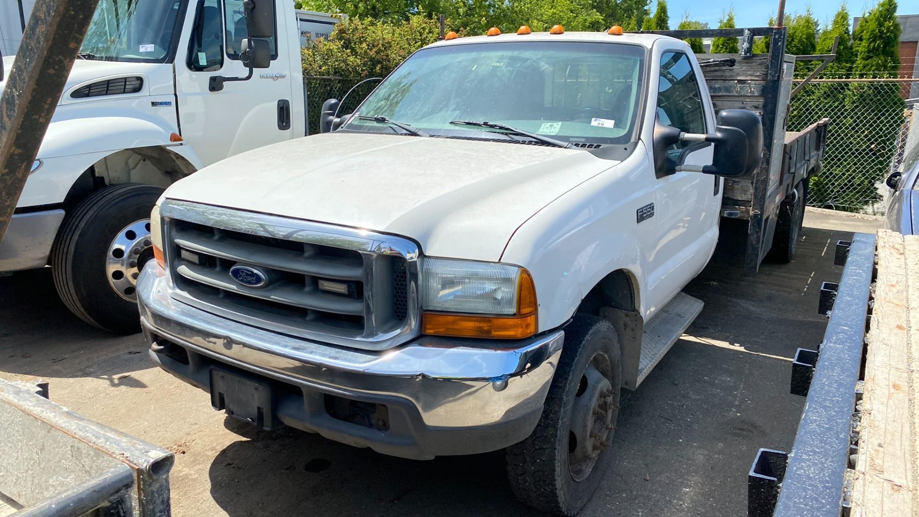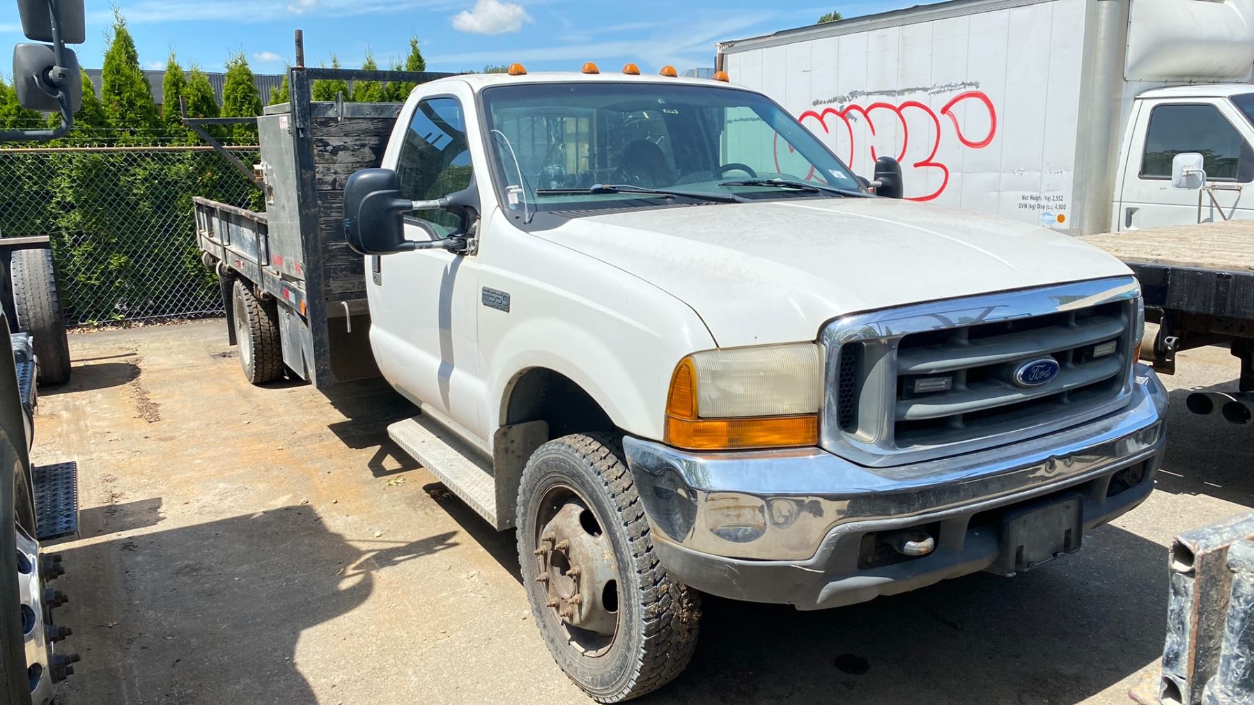*R* 1999 FORD F550 XLT SUPERDUTY, 2DR FLATDECK, WHITE, VIN 1FDAF56F6XEC64795, 436,993 KMS, 7.3L, DIESEL, AUTO, KEYS, STARTS, 6 WHEELER, WORK BOX ON DECK AND SIDES, HEADACHE RACK, STRAPS ON SIDES, 4 WORK BOXES, FOLDED SIDES, 10" HIGH ON DECK, MINOR RUST ON DECK, TORN DRIVER SEAT, POWER LOCKS DON'T WORK, RD, CD, PW, CC, TW, *HAS REGISTRATION* ICBC DECLARATIONS - 1 X GLASS REPAIRS $508.71