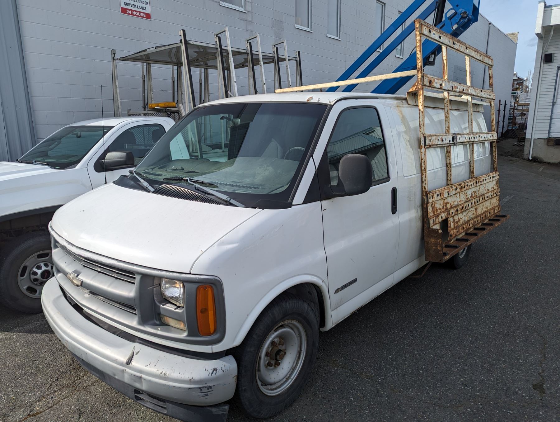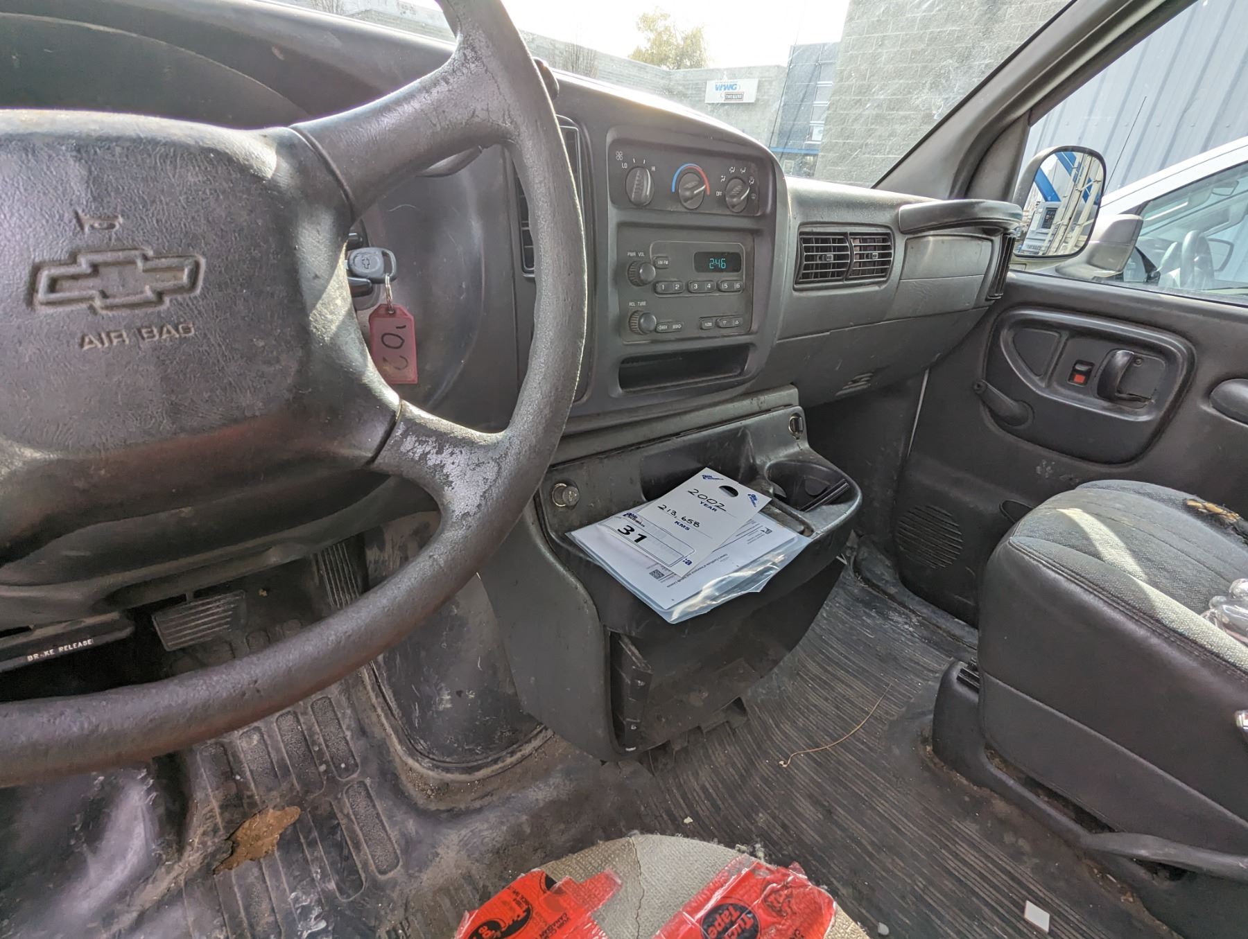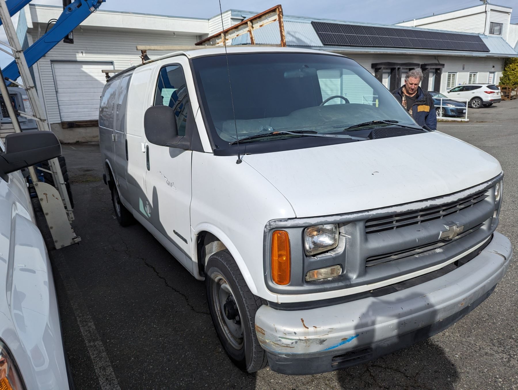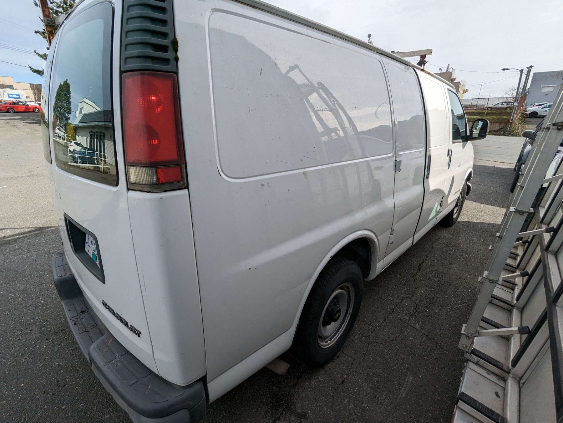*R* 2002 CHEVROLET EXPRESS VAN, WHITE, VIN 1GCFG25M321212661, 213,658KMS, GAS, AUTO, HAS KEYS, RD, SEATS ROUGH, STARTS & RUNS, MUSTY SMELL, SCUFFS, DENTS, DAMAGE IN PHOTOS, VEHICLE STILL IN USE SO ODO MAY VARY SLIGHTLY, 1 X ICBC NO DETAILS, ICBC $735.89, *HAS REGISTRATION*