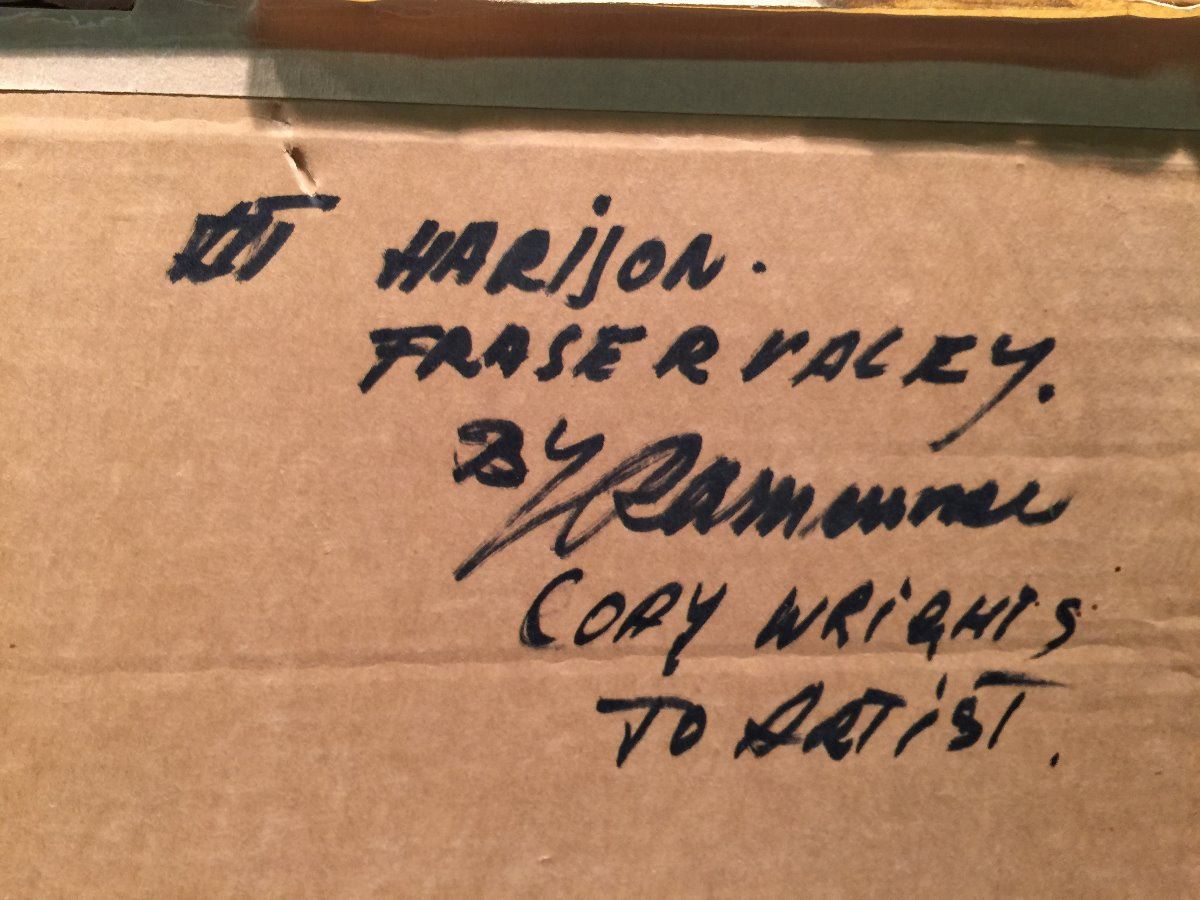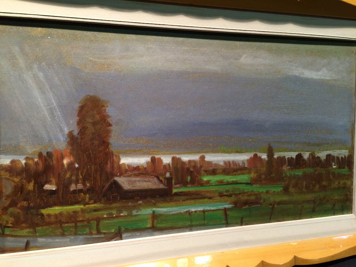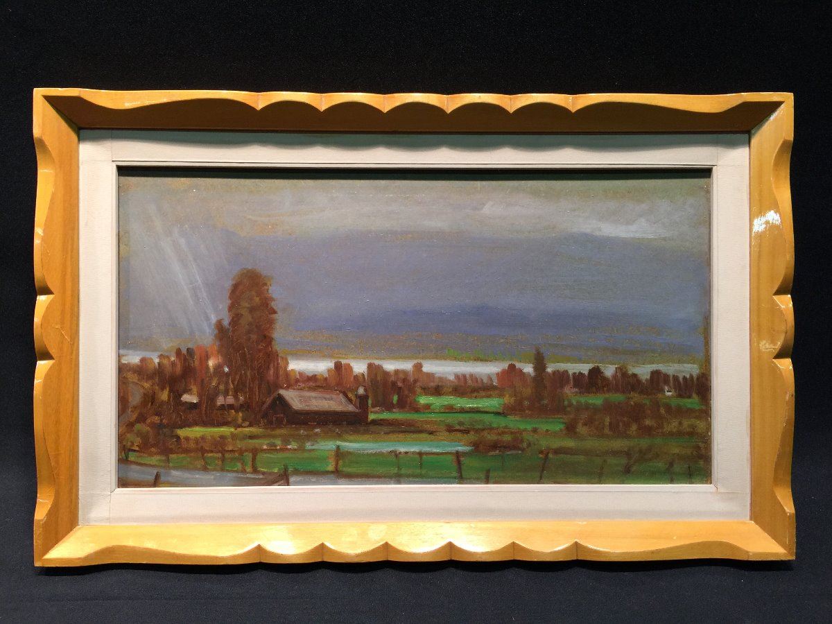 R.A. MESSMER, 1965, UNTITLED FRAMED ORIGINAL, 'FRASER VALLEY SCENE', OIL ON BOARD, 19'' X 11''