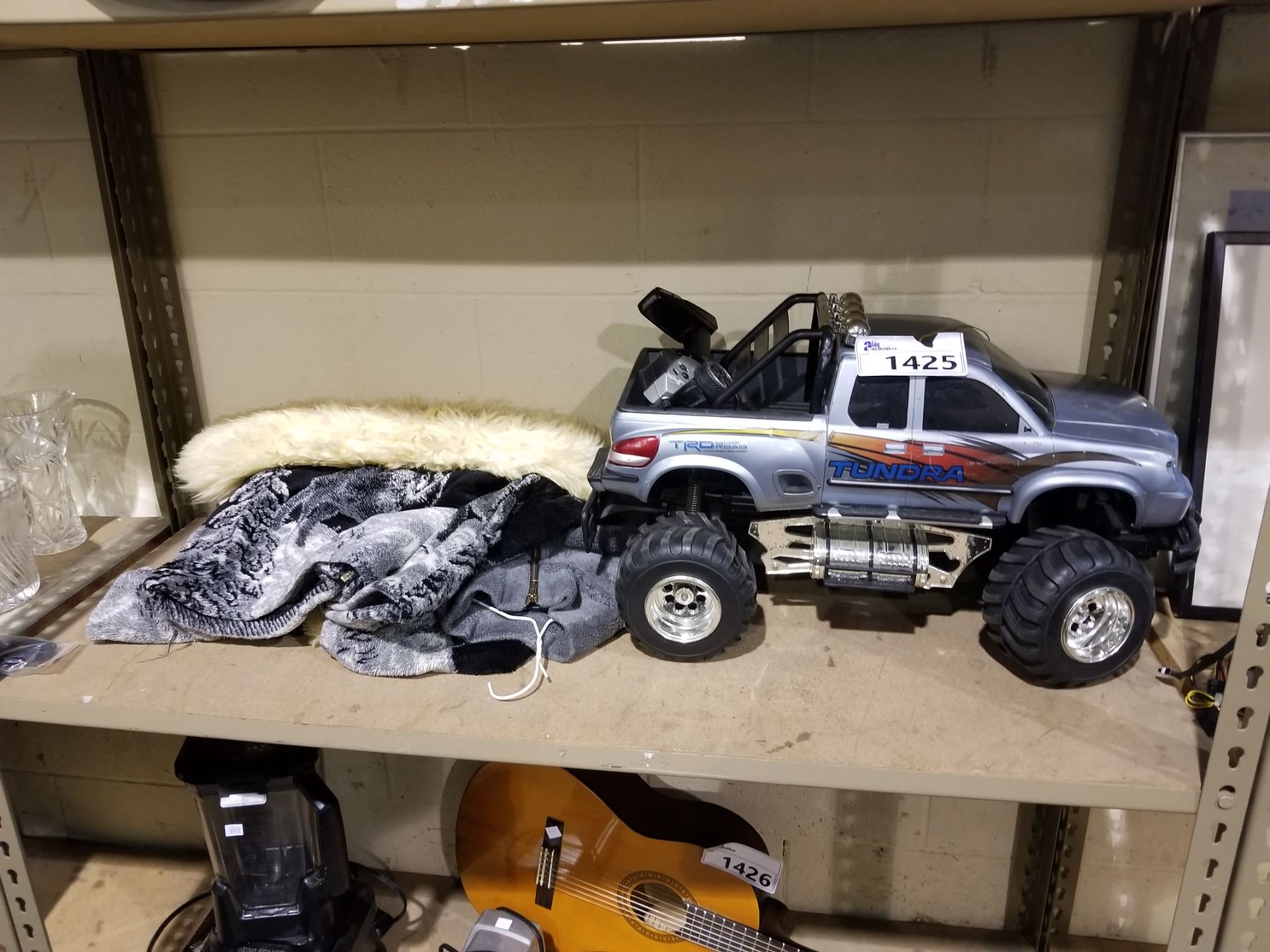 R/C TRUCK WITH REMOTE, BLANKETS, ETC