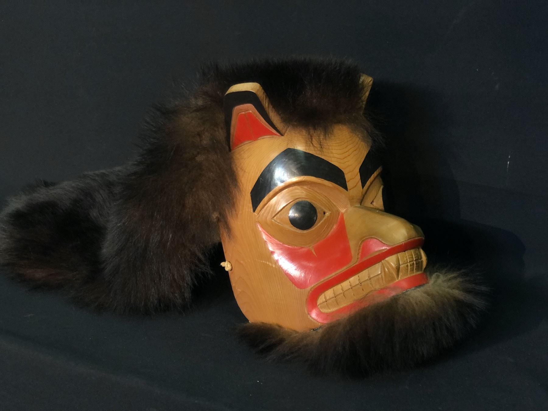 R. HARRIS HAND CARVED AND PAINTED GITXSAN BEAR MASK WITH FUR ACCENTS, DATED 1991, SIGNED BY ARTIST,