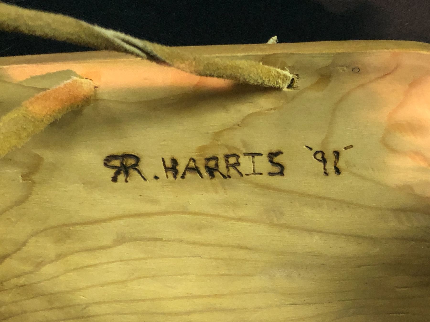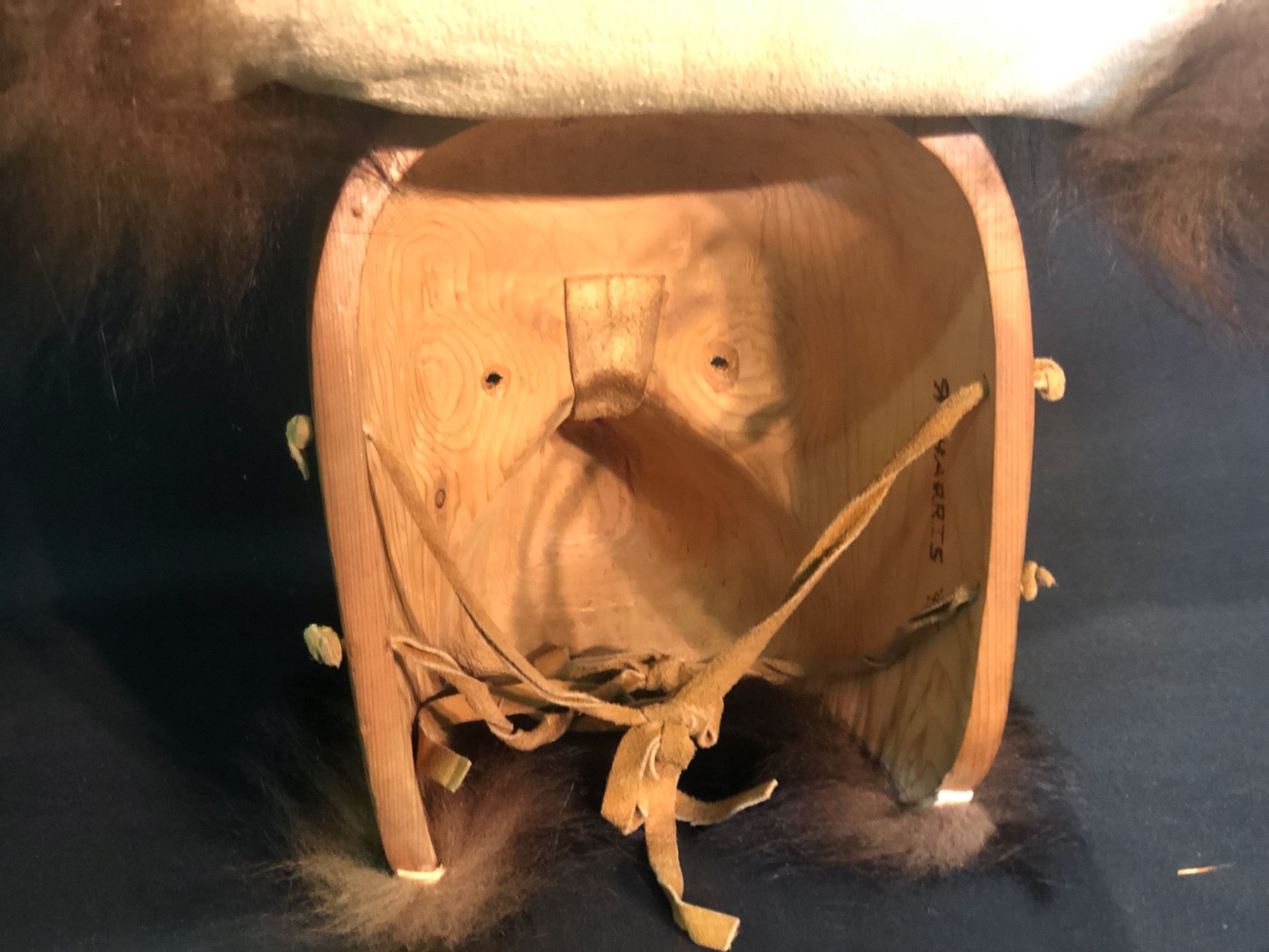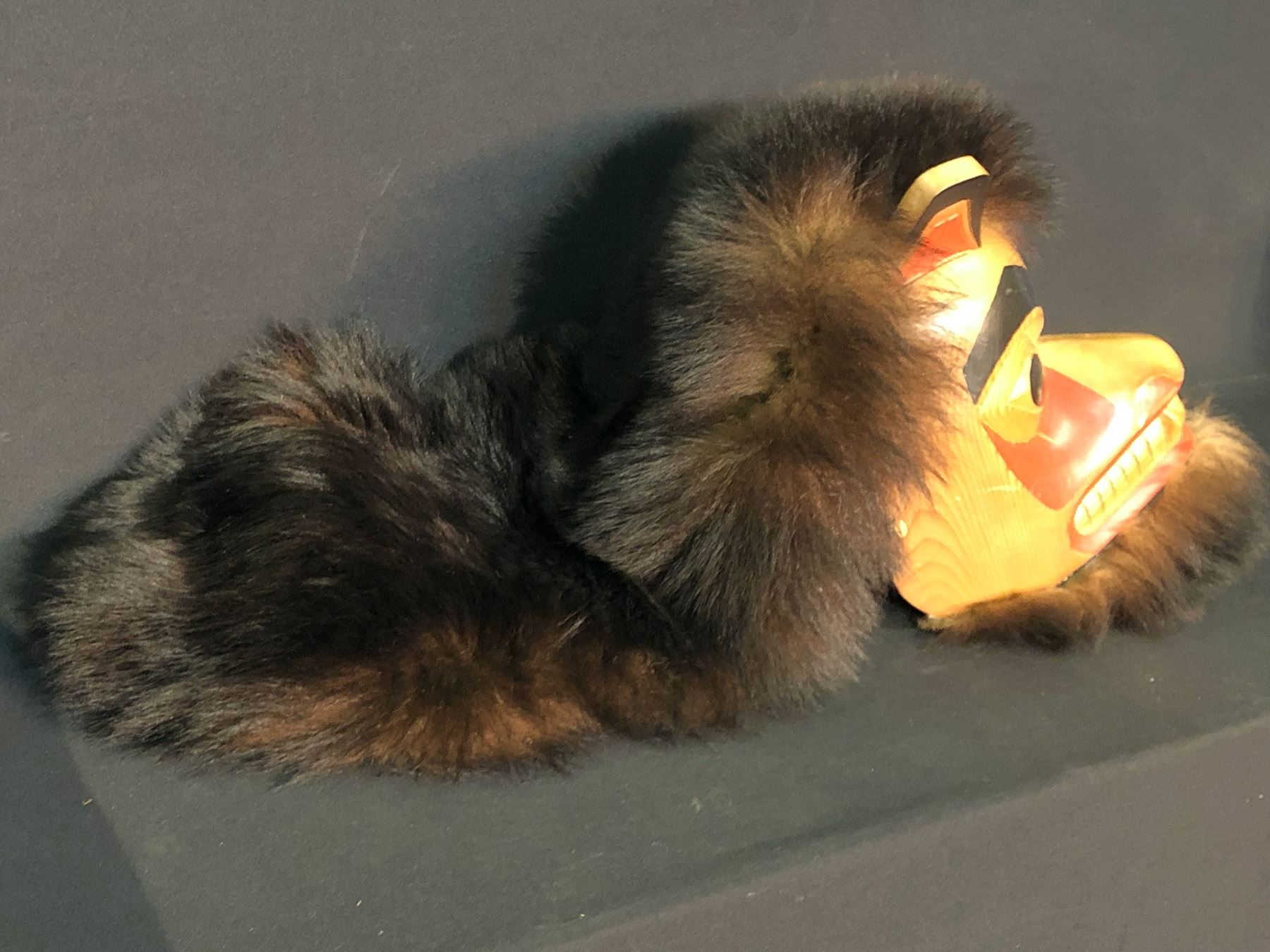 R. HARRIS HAND CARVED AND PAINTED GITXSAN BEAR MASK WITH FUR ACCENTS, DATED 1991, SIGNED BY ARTIST, APPROX. 25'' TALL INC. FUR ACCENT