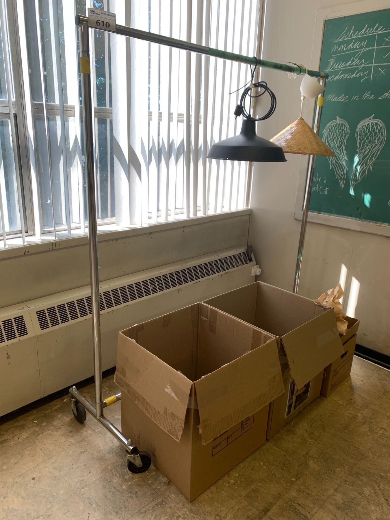 RACK & 3 BOXES OF ASSORTED HANGING LAMPS