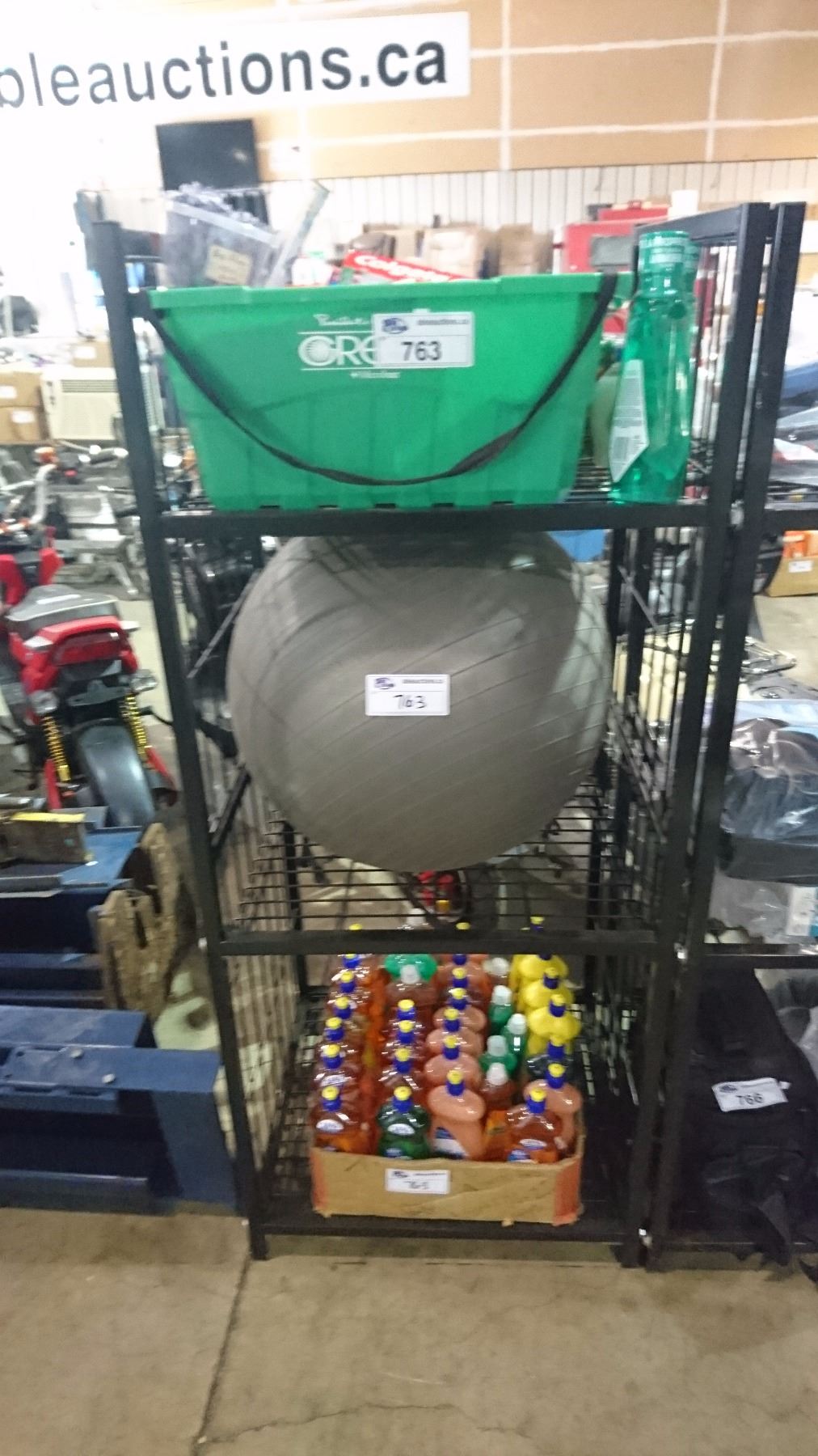 RACK LOT OF ASSORTED SOAP, TOOTHPASTE, EXERCISE BALL & MORE